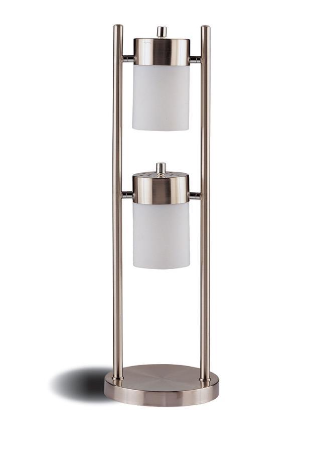 A quaint, modern-inspired piece, this two-light metal lamp is a great lighting solution to adorn your table or desk. Both lights are on an adjustable swivel and feature a frost glass cylinder shade. The brushed silver finish adds to a room without overpowering existing design elements, making this a great accent piece.Model: CS732