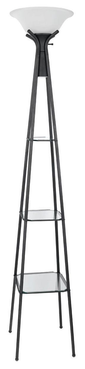 A combination piece, this lamp and shelving unit is a unique way to store your accent pieces. Featuring three glass shelves for storage, upward and downward facing lights, and a frosted glass shade, this lamp has all kinds of interesting features! This tall floor lamp is perfect for those in search of a lighting fixture that combines high style with unique function.Model: CS420