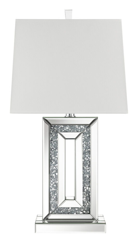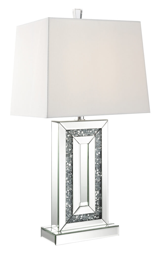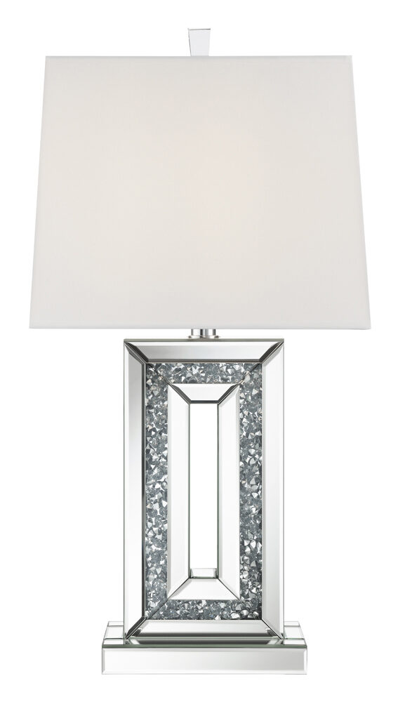 Glimmering dark crystal-like accents emerge from the base interior of this stunning contemporary table lamp. A narrow base outlined in mirror tile accents the edges, creating a beveled look. Mirror tiles also line the flush base, further lending to the reflective, polished nature of the lighting piece. Surrounding the bulb is a square shade wrapped in a white fabric to create a soothing, diffused glow. A transparent acrylic finial tops it all off for one last luxe touch.Features:
