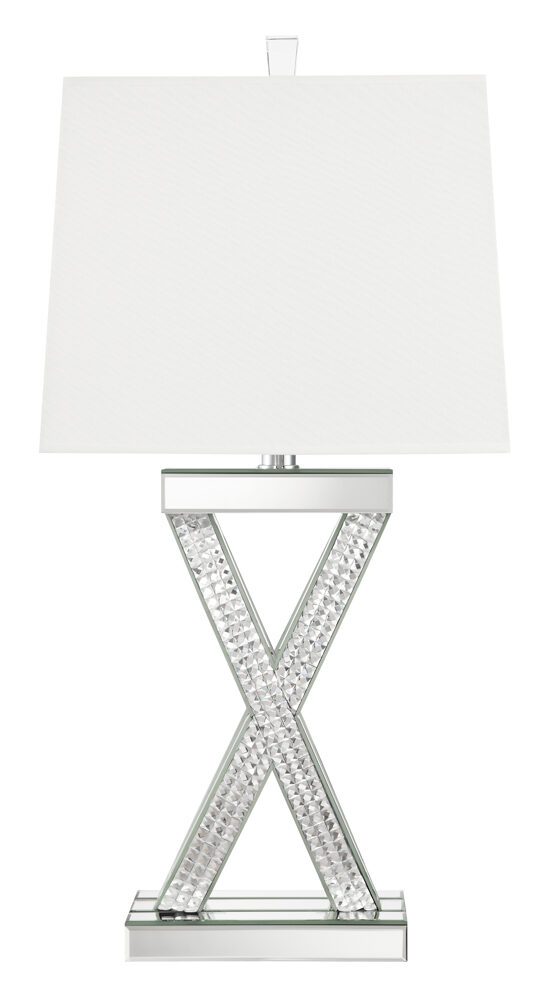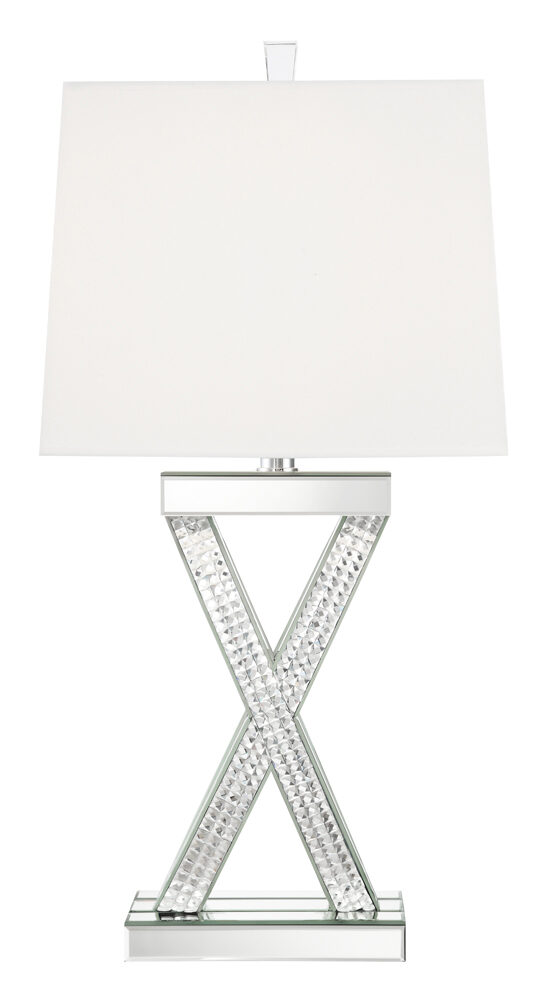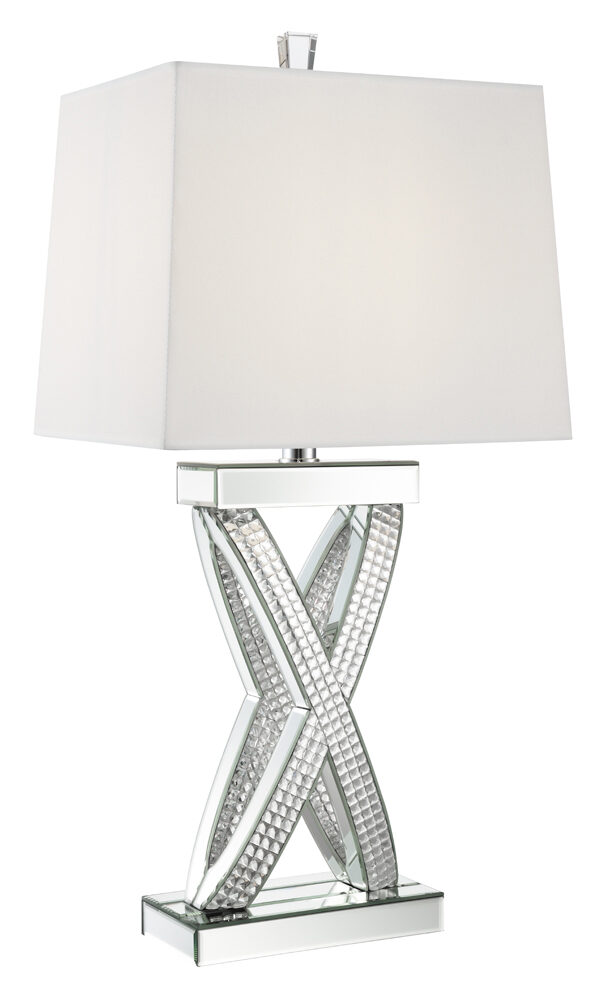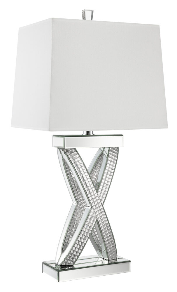 Bold, interwoven lines create an x-shape base of this contemporary table lamp. With a glamorous flair, this stunning table lamp offers up a border of polished square tiles inset within a mirror trim silhouette design. A flush top and bottom covered in mirror tiles holds the sculptural brace intact for a dimensional effect. Topped by a tapered rectangular shade covered in a white fabric, this table lamp puts out a soft, soothing glow to a modern tablescape. An acrylic finial adorns the top for one last dramatic touch.Features: