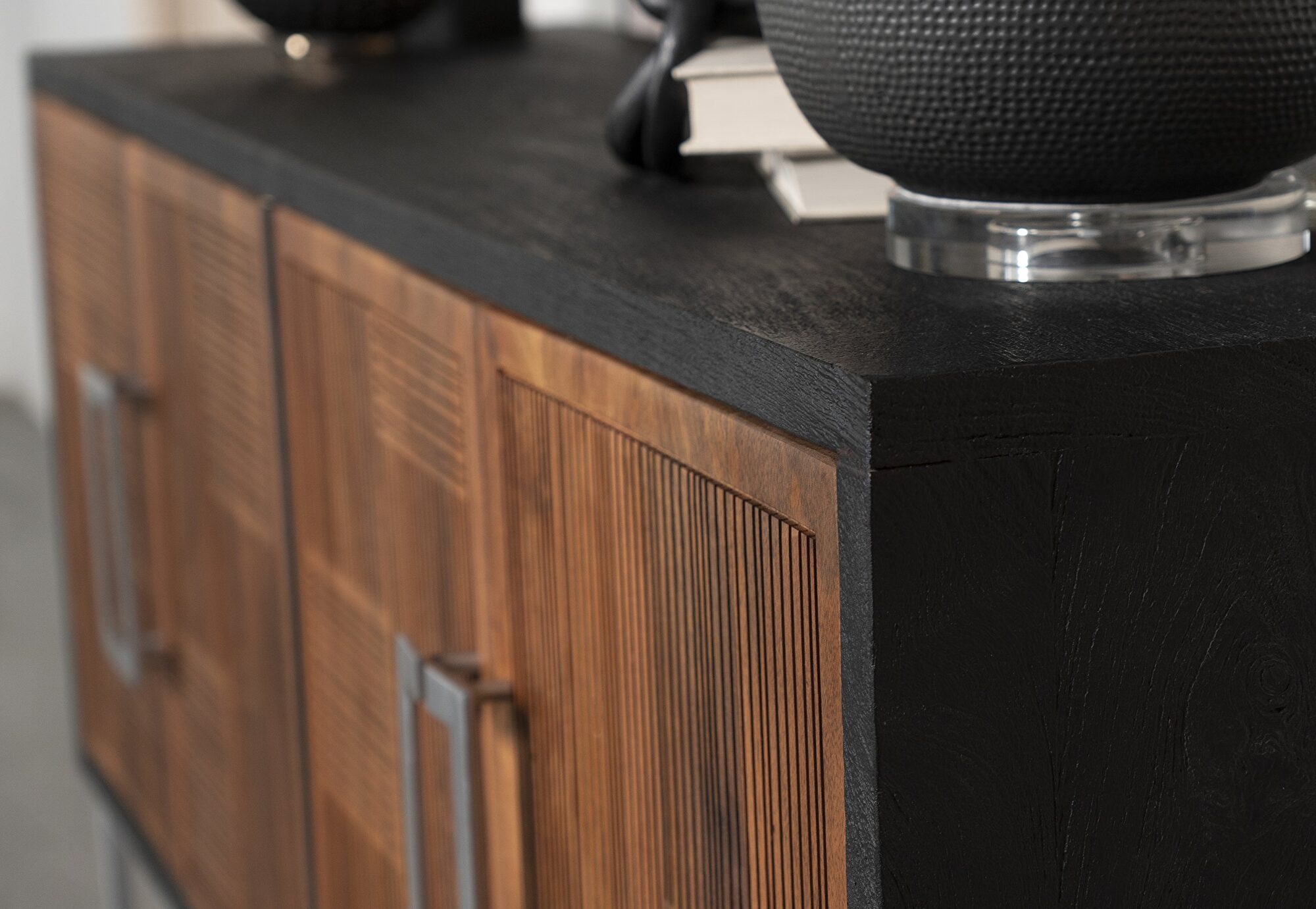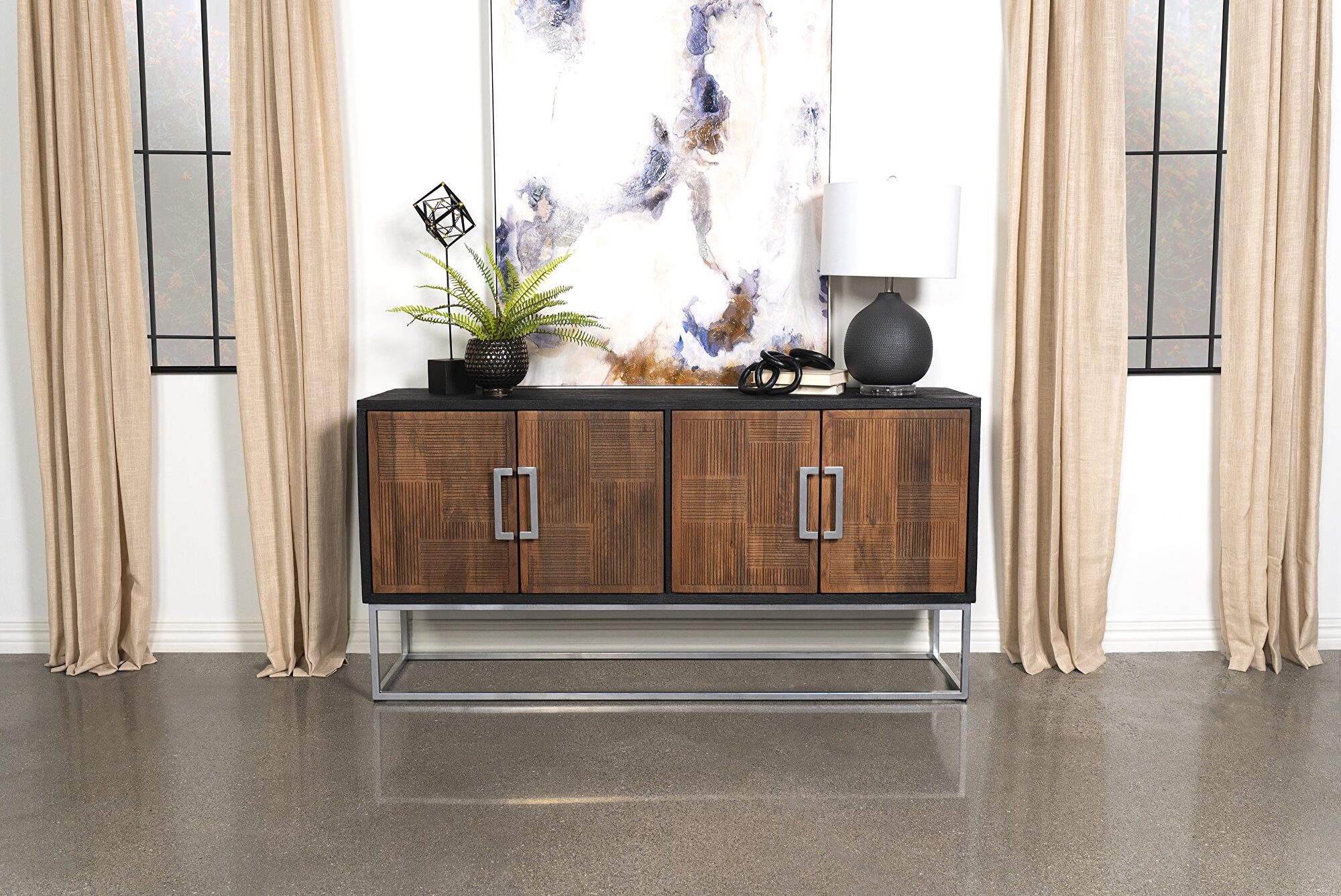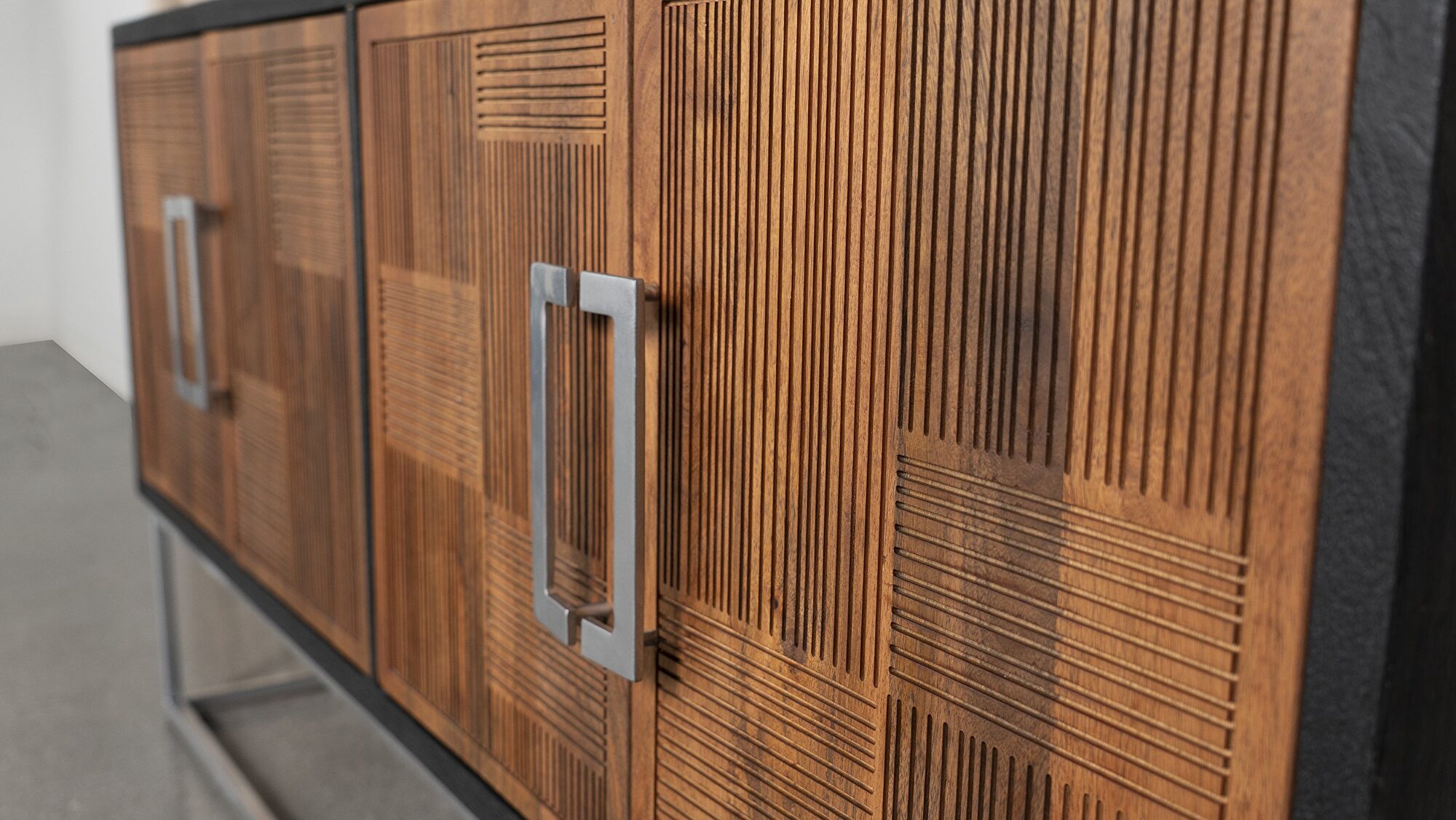 Asian inspiration creates the decadence you seek in outfitting a dining room or living space. This accent cabinet reflects a level of minimalism dressed up with gorgeous finishes to create an exotic ambiance with plenty of function. Rich walnut finish mango wood front panels and a black case offer a mix of smooth and textured effects, as a bracket-style iron frame and matching door hardware create a compelling palette. Find space on two fixed interior shelves behind each set of doors to store dishes, serve ware, or anything that needs to be tucked away. Smooth drawer closure is possible thanks to magnetic closures.Features: