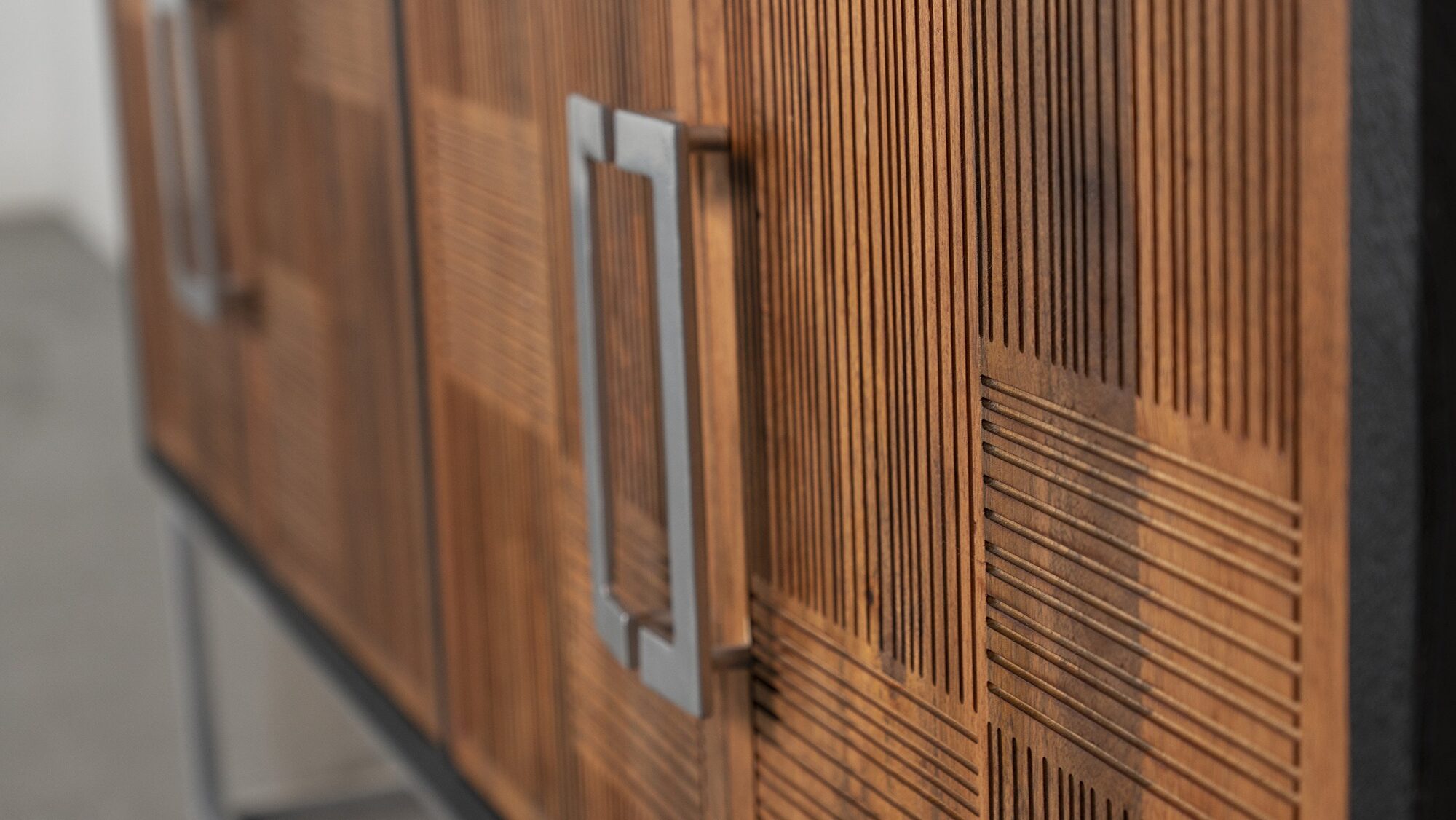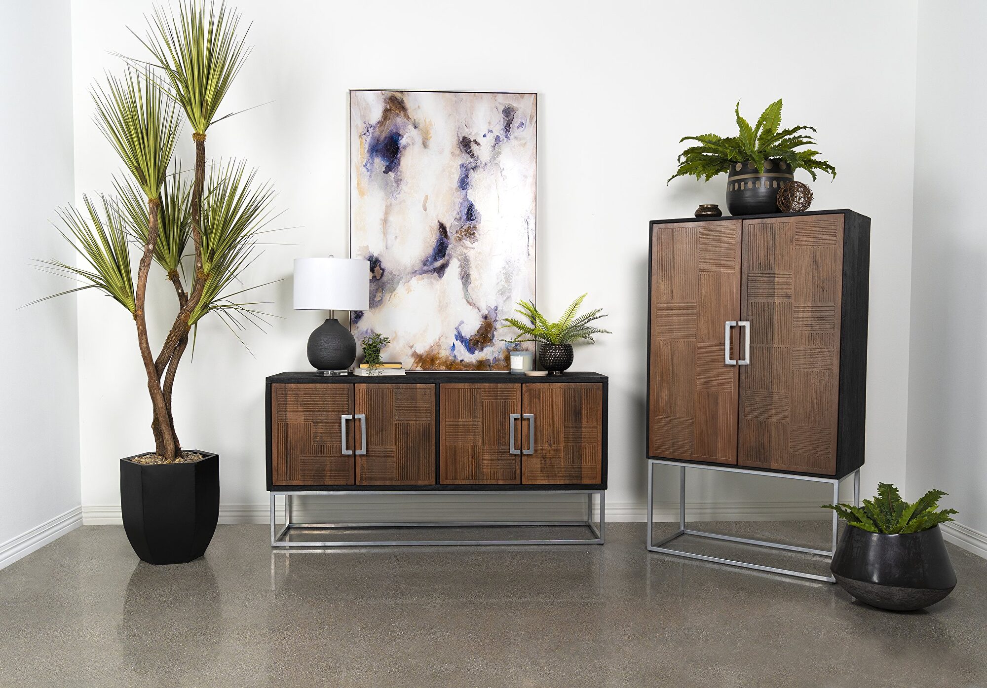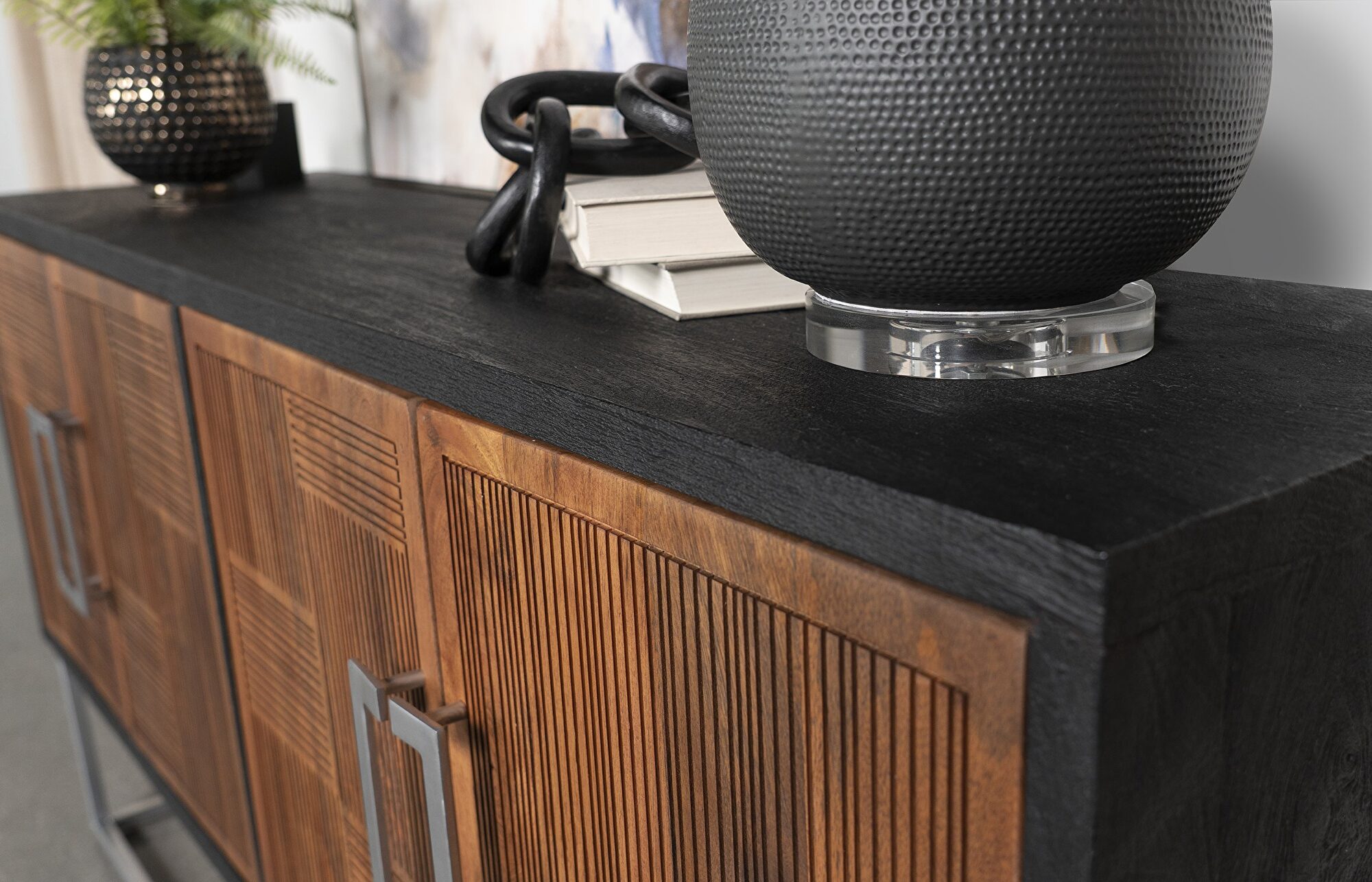 Asian inspiration creates the decadence you seek in outfitting a dining room or living space. This accent cabinet reflects a level of minimalism dressed up with gorgeous finishes to create an exotic ambiance with plenty of function. Rich walnut finish mango wood front panels and a black case offer a mix of smooth and textured effects, as a bracket-style iron frame and matching door hardware create a compelling palette. Find space on two fixed interior shelves behind each set of doors to store dishes, serve ware, or anything that needs to be tucked away. Smooth drawer closure is possible thanks to magnetic closures.Features: