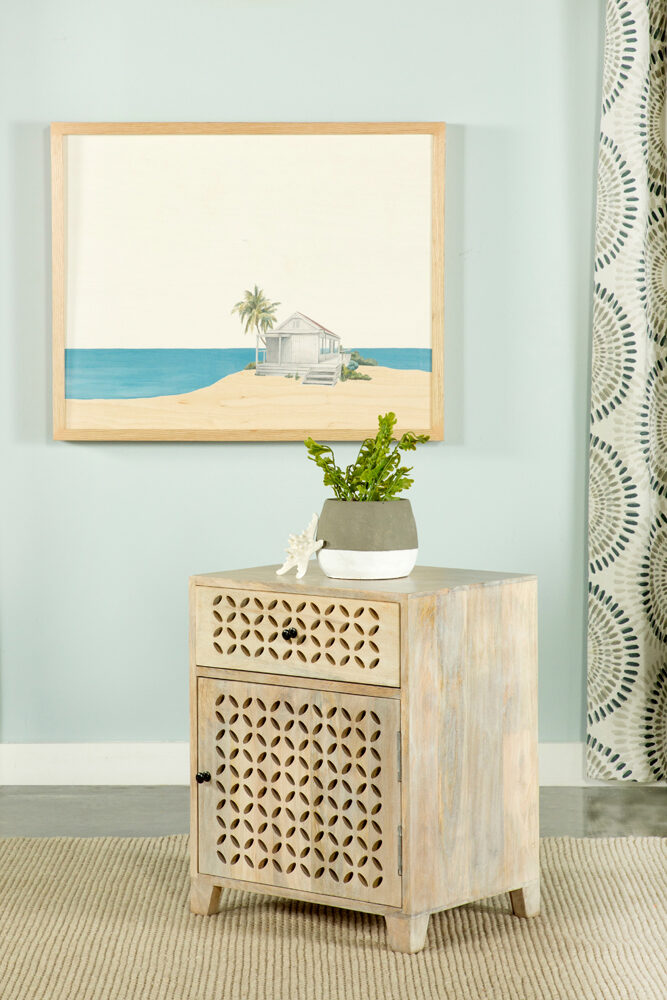 Built from an eco-friendly solid mango wood for sustainable homes, this contemporary accent cabinet makes a striking statement piece in a space. Designed with a lightly hued, whitewash finish, this accent table lends itself nicely to a variety of color palettes and decor styles. Diamond-like lattice cut outs along the front cabinet and drawer front offer charming elements to the simple, smooth surfaces of this understated furniture piece. Store essentials in a top drawer and the bottom cabinet, keeping the tabletop free of clutter. Place this lovely accent table in a beach bungalow and allow it to double as a nightstand in a global-inspired, eclectic bedroom.Features:
