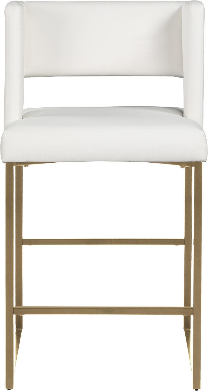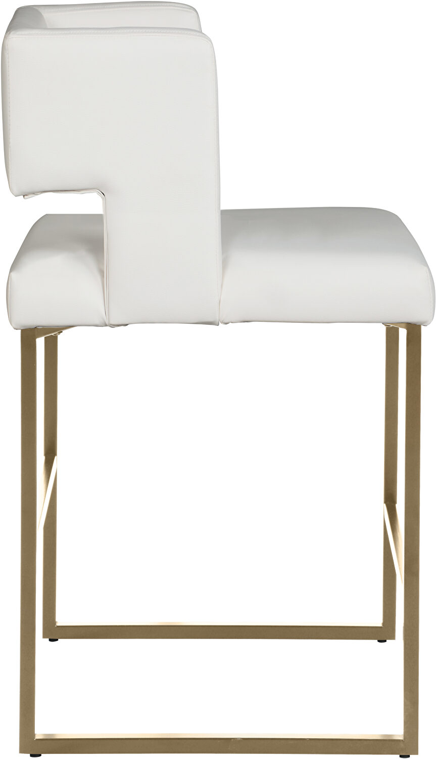 Contemporary square bar stool w/ unique square stylish back. Golden legs, white vegan leather. Few colors available, shown here in white.Features: