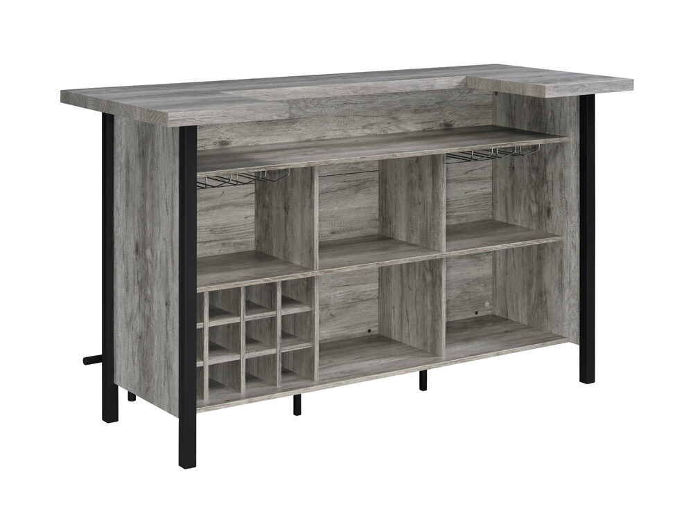 Add functionality and style to an entertainment space with this rustic bar unit, appointed in a gray driftwood-inspired finish with distinctive metal details throughout. Perfect for holding and organizing barware, bottles and all your mixologist essentials, this bar offers six stemware racks and a 12-bottle wine holder. In addition, five open cubbies and compartments can keep all your libations. Pull up a stool to this u-shape bar and rest your feet on the attached footrest, designed from a heavy gauge, black powder coated metal. With a tiered design in back, you can create a neat and tidy bar for country-inspired homes and apartments.Features: