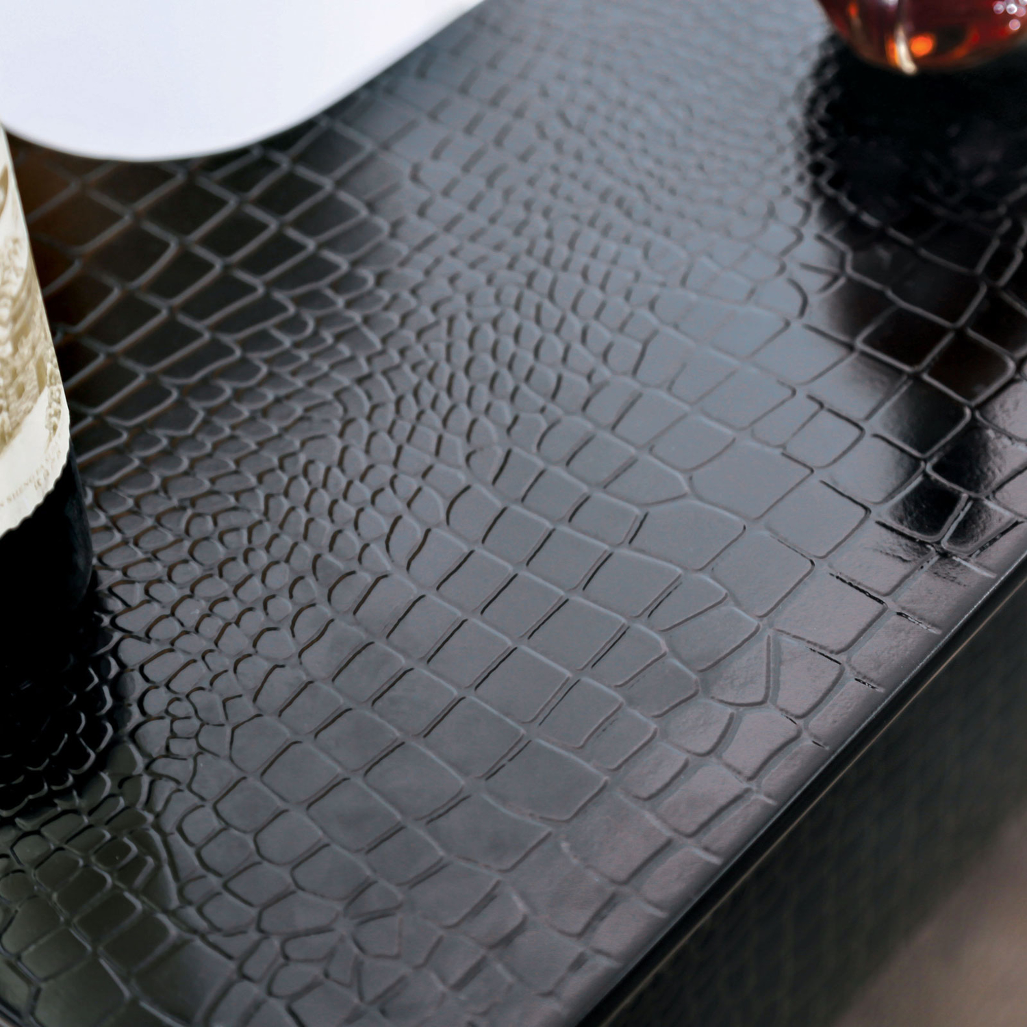 Shine and polish your dining room to pure glamour. Tempered glass, mirrored panels, and crocodile embossed details form a luxurious dining set. Rest yourself upon tufted leatherette chairs and sink into soothing comfort with its dense foam cushions. The expansive table top offers spacious room for six, with carved tapered legs steadily supporting this luscious design.Features: