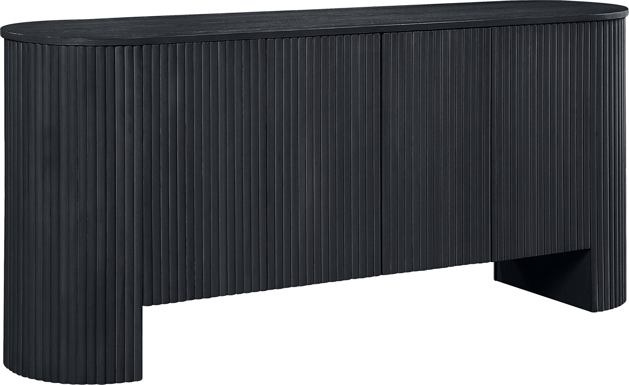 Elevate your dining experience with the Belinda Black Sideboard/Buffet, where functionality meets sophisticated design. Crafted from a harmonious blend of oak veneer, solid wood, and MDF, this sideboard offers a robust solution to your storage needs without compromising on style. Its deep black finish provides a striking contrast, adding an air of elegance to your dining space. The fluted detailing infuses a classic touch to its contemporary silhouette, ensuring it complements any modern decor. This piece isn't just about utility; it's a testament to quality craftsmanship and an enduring aesthetic that captivates and serves. Make a statement in your home with this exquisite sideboard that promises to keep your dining essentials neatly organized while enhancing the overall ambiance of your gatherings.Features: