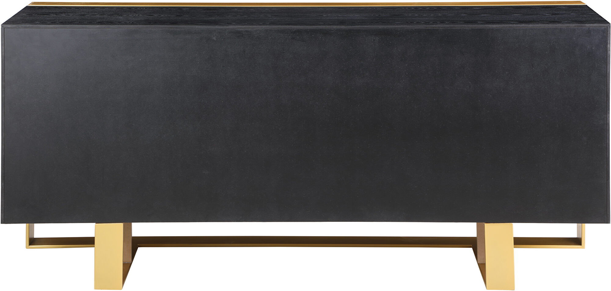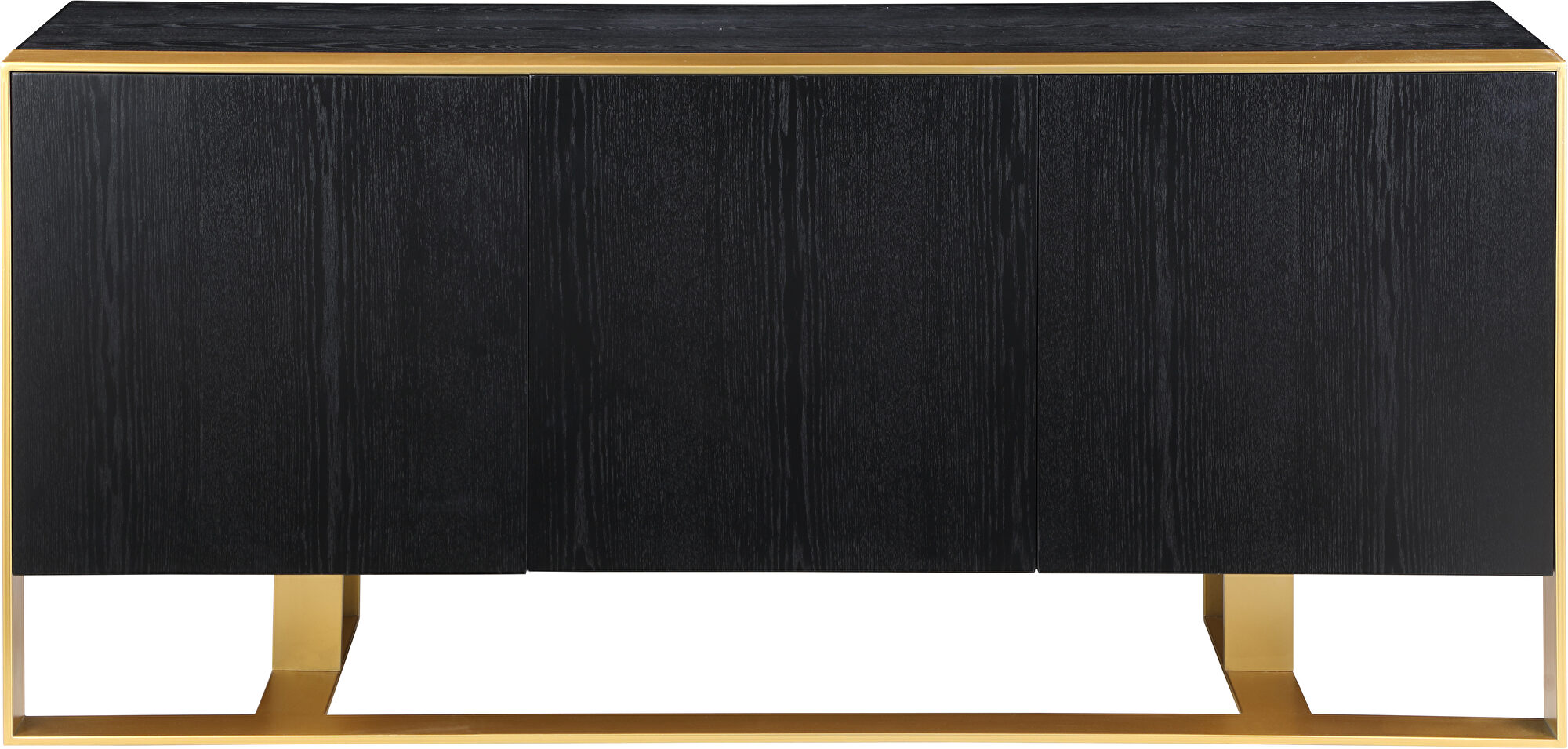 Elevate your dining space with the sophisticated Sherwood Sideboard Buffet, where functionality meets modern elegance. This sideboard, showcasing a striking contemporary design, pairs the rich, deep tones of black oak wood veneers with the lustrous accent of brushed gold trim. The gold iron base adds a touch of luxury, creating a statement piece that's as durable as it is stylish.Constructed from the finest solid wood and metal, the Sherwood sideboard promises longevity and enduring appeal. Behind its three sleek doors lie two spacious shelves, offering ample room to organize and store your dining essentials. From fine china to everyday dishes and serving accessories, everything finds its place, keeping your space clutter-free and ready for entertaining or family dinners.