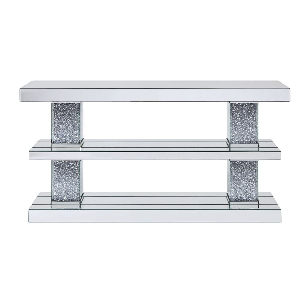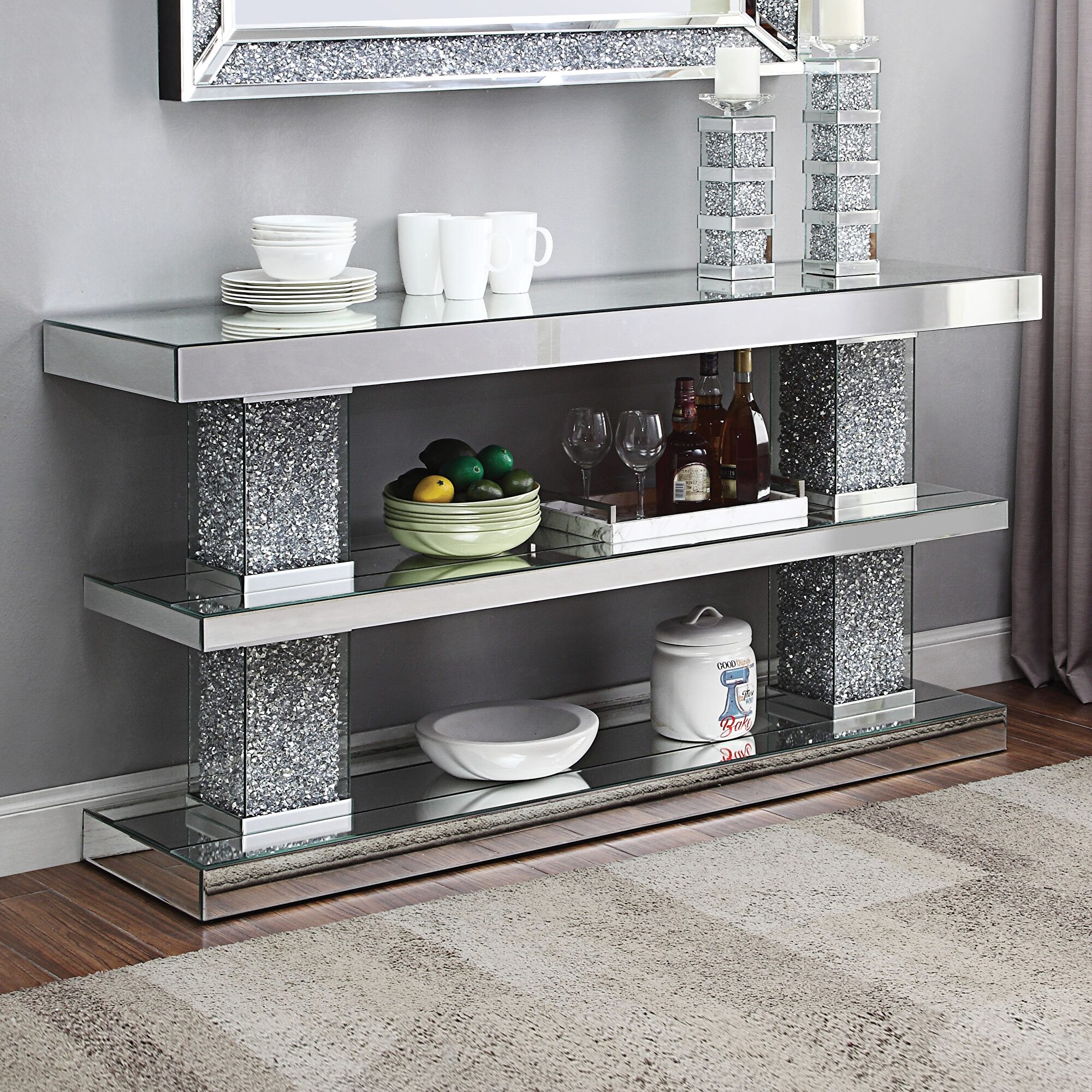 Elevate your dining space with the Noralie Dining Table, a masterpiece of modern design that seamlessly blends elegance with a bold, contemporary edge. This sophisticated table redefines the classic pedestal form, featuring an eye-catching angular base adorned with shimmering mirror and faux diamond inlays. The unique X-shaped pedestal base stands as a testament to innovative design, while the 15-mm tempered clear glass top adds a touch of sleek transparency. Ideal for memorable dinner parties and chic gatherings, this table is the epitome of luxury. Crafted with the finest materials including mirror, glass, MDF, and sparkling faux diamonds, this dining table's mirrored beveled edges and faux diamond inlay exude a refined charm that is sure to captivate. To achieve a cohesive and glamorous dining room, consider pairing this table with matching chairs and server, available as options to complete the vision of opulence.Features: