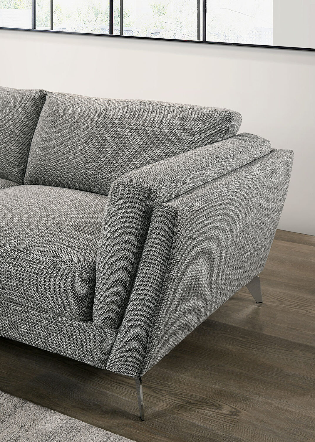 This refreshing mix of Mid Century Modern and a hint of Art Deco provides a refreshing theme that maintains a sense of sophistication. Soft textured woven fabric sets the tone. Arched armrests effectively correspond to the angles of the uniquely geometric chrome feet. Bountiful broad seats and equally plush back cushions provide exceptionally soft comfort and the addition of removable matching padded armrest buffers allow versatility in the accommodation of relaxation.Features: