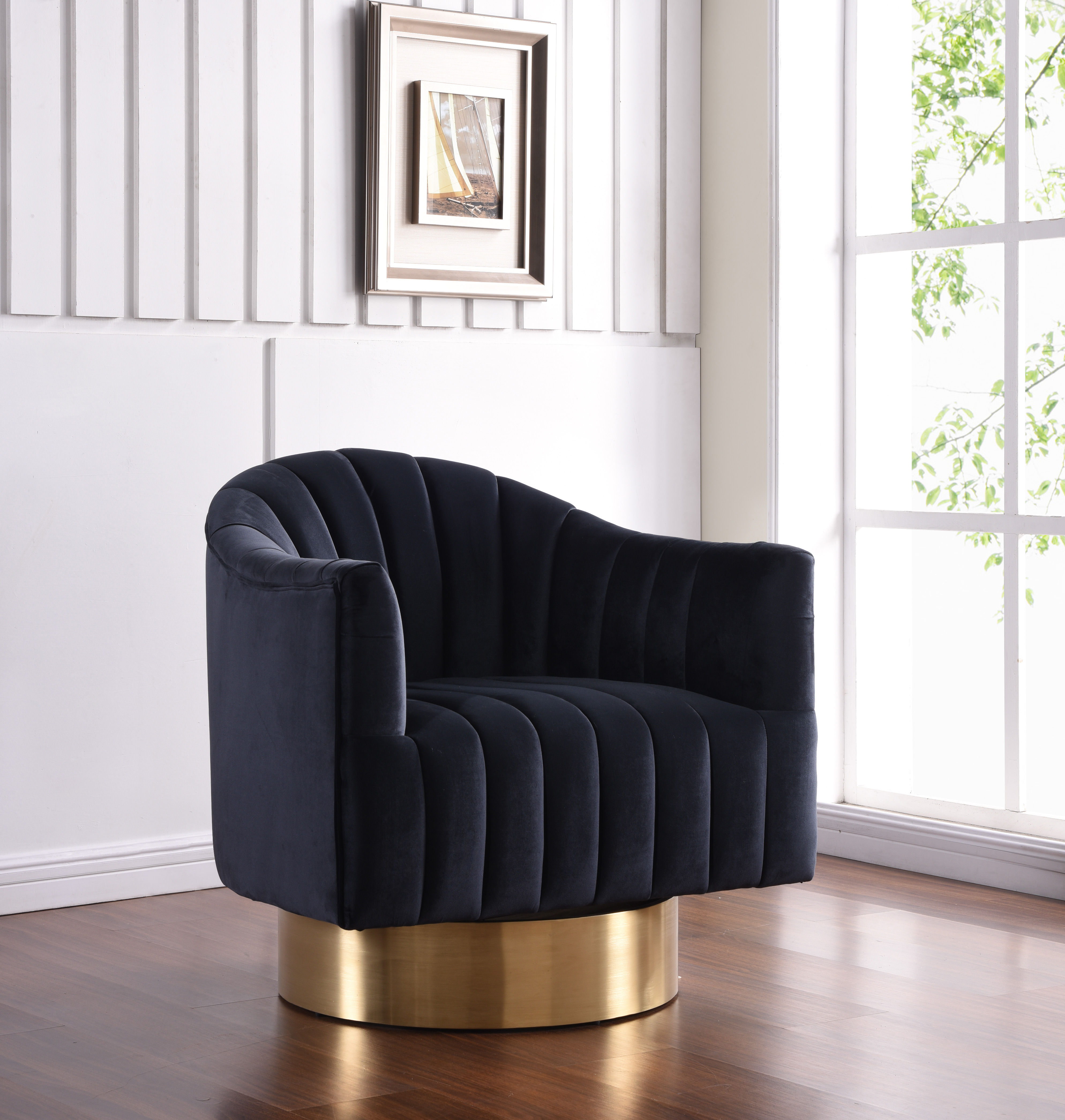 Get comfortable in this Farrah black velvet chair. The chair's thick upholstery covers a premium foam design that makes it super comfortable while you read or watch TV. The green upholstery matches other existing furnishings in your space, making it easy to integrate with other furniture. The chair sits on a gold base made from stainless steel for durability and long-lasting performance. The base swivels, sealing its reputation as the home's favorite seat.Features: