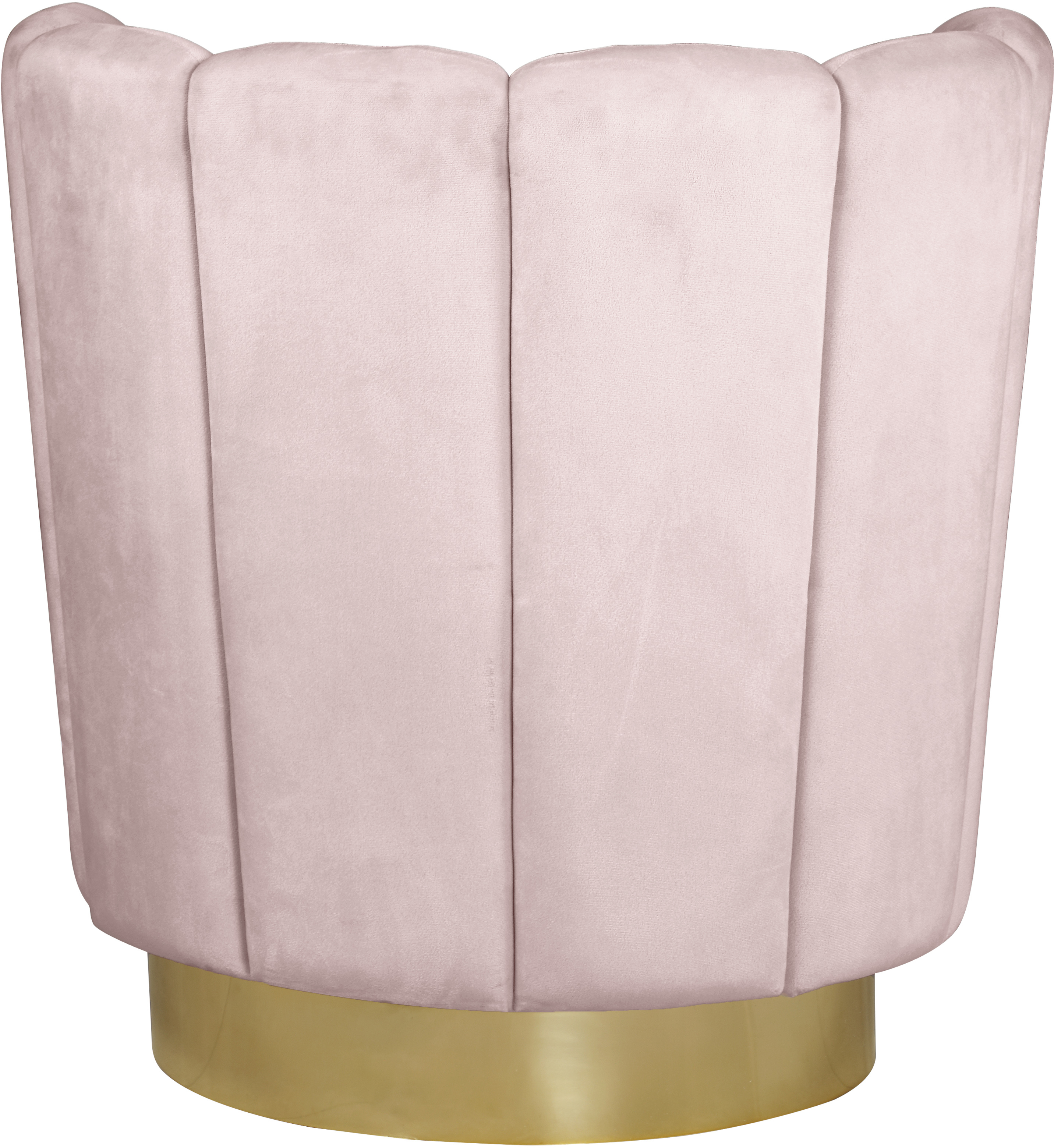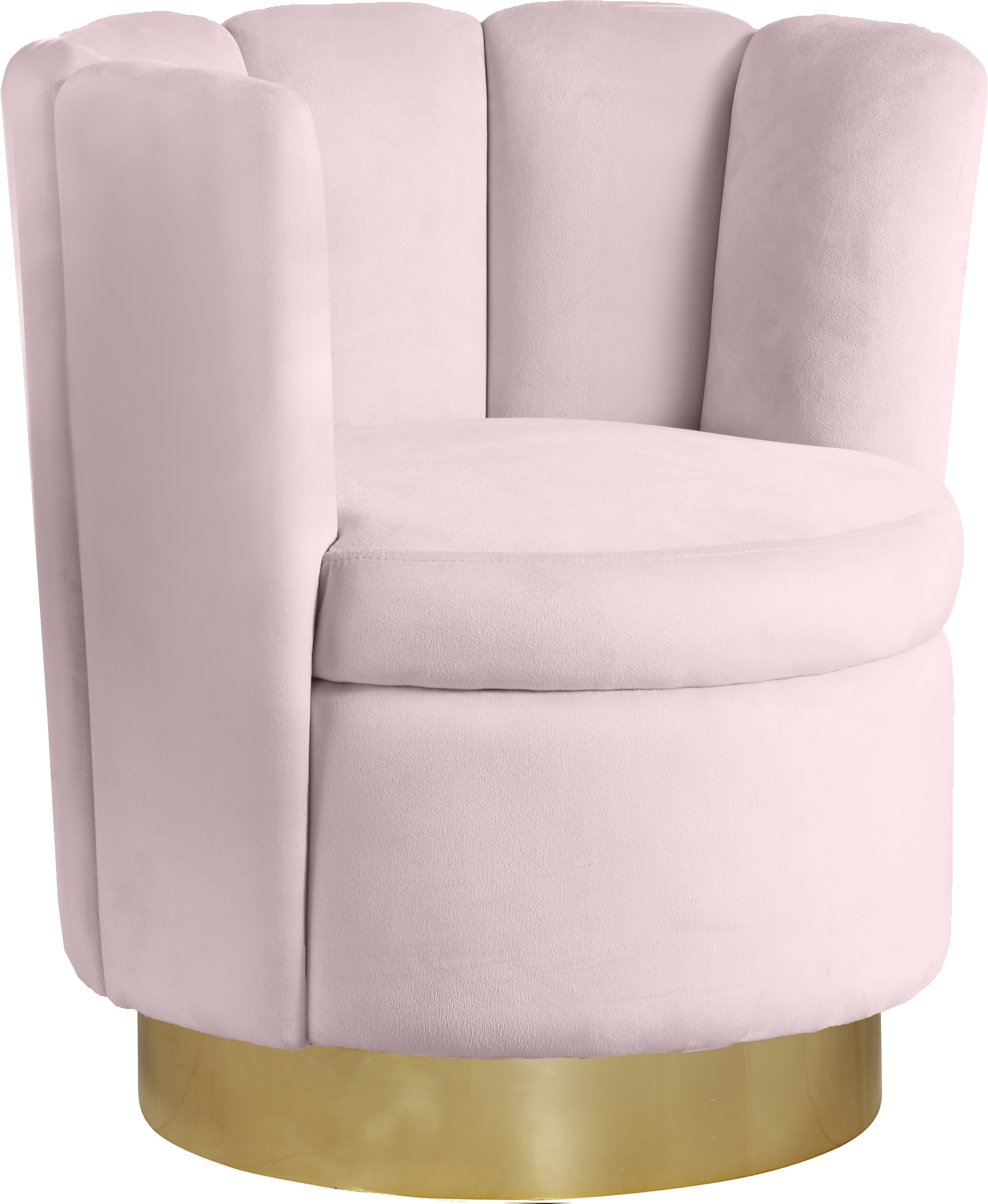 Spruce up your home with this elegant Lily Pink Velvet Accent Chair. Its curved design and soft pink velvet upholstery give it a sophisticated appeal that complements your existing contemporary décor and home furnishing. A gold steel swivel base provides solid support, as well as freedom to turn and face whichever direction you choose while you curl up with a beloved book or in front of your favorite TV show.Features: