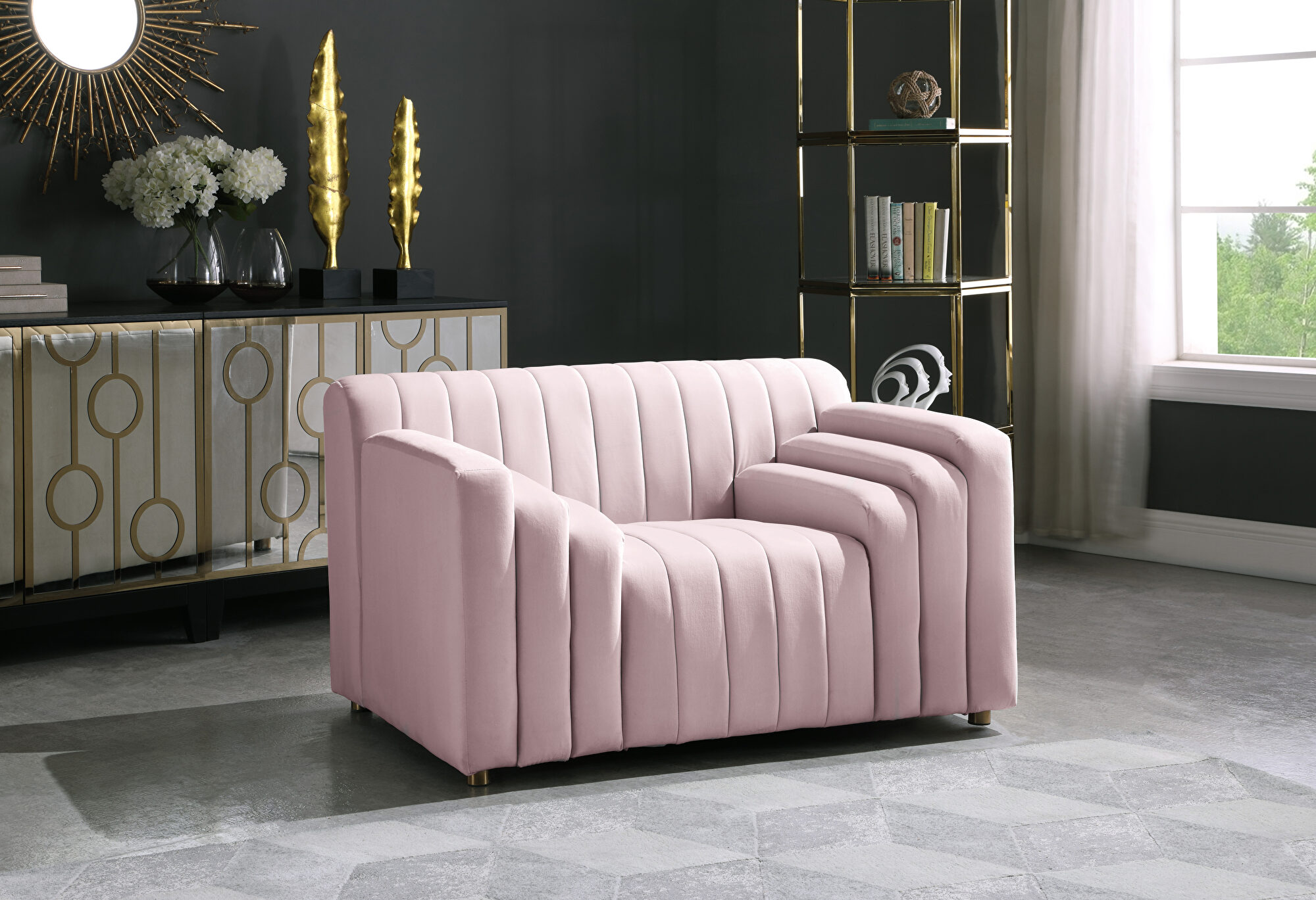 Beautifully designed with dramatic dropping level armrests, Naya chair in pink is truly a piece to remember. Features low profile, unique styling and quality craftsmanship. Matching pieces available. Few other colors available.Features: