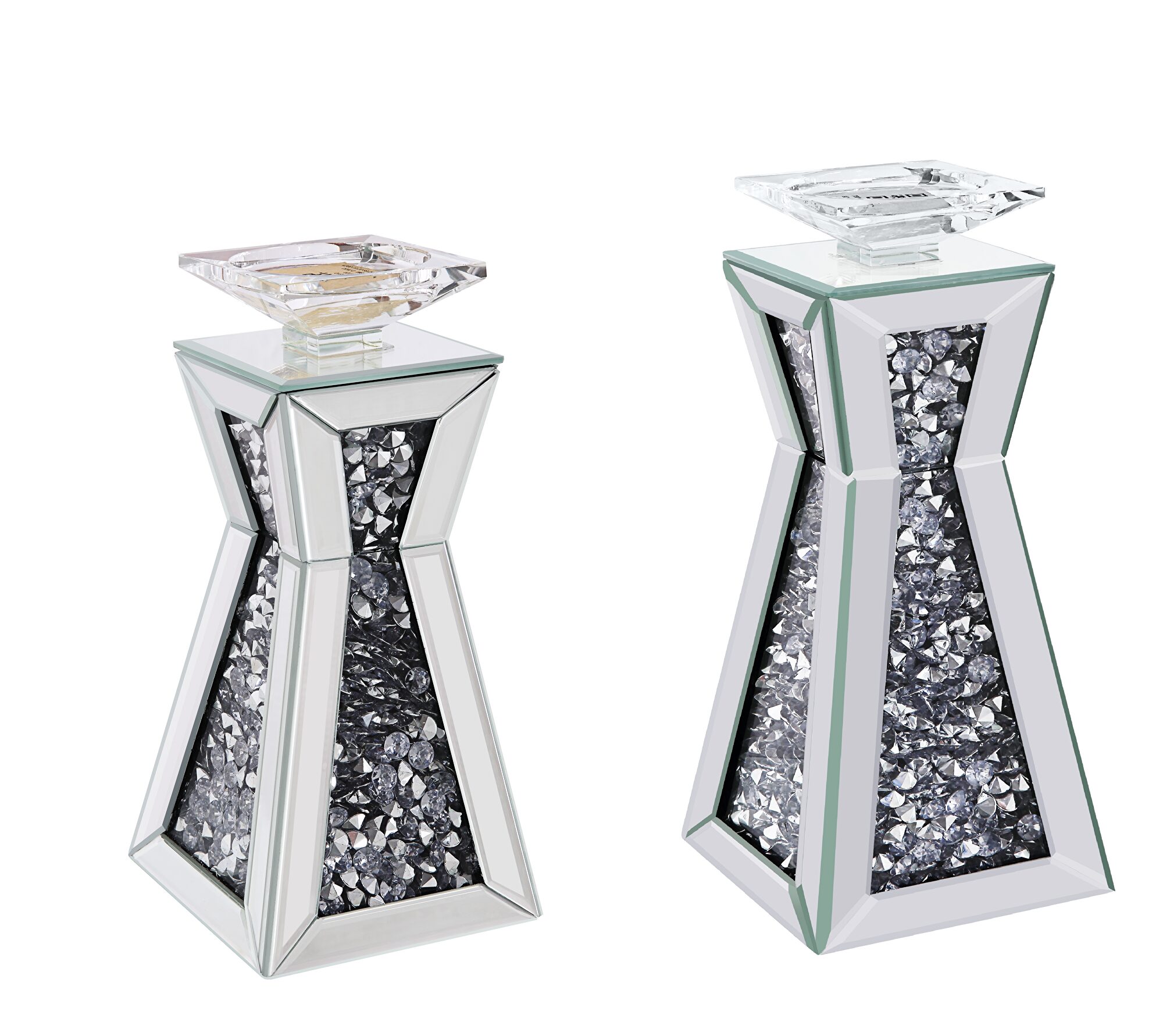 Strut your style with this beautiful and elegant Nowles III candleholder collection. With a beautifully crafted mirrored frame and faux gem inlay, it is sure to compliment any arrangement. Available in two different sizes, light it up and be dazzled by the glamour of this piece.Features: