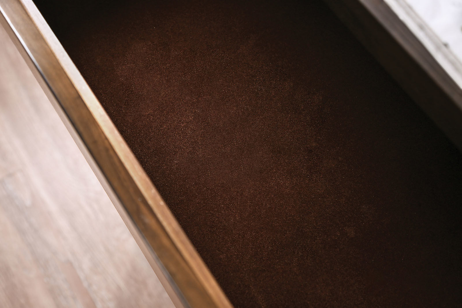 Our hand-made looking chest is crafted with a rich reclaimed wood aesthetic for an authentic country feel you simply cannot get any other way! It features split wood drawer face planks with modern styled dark walnut siding to help tone down the powerful rustic elements and bring a modern fashionable subtlety.Features: