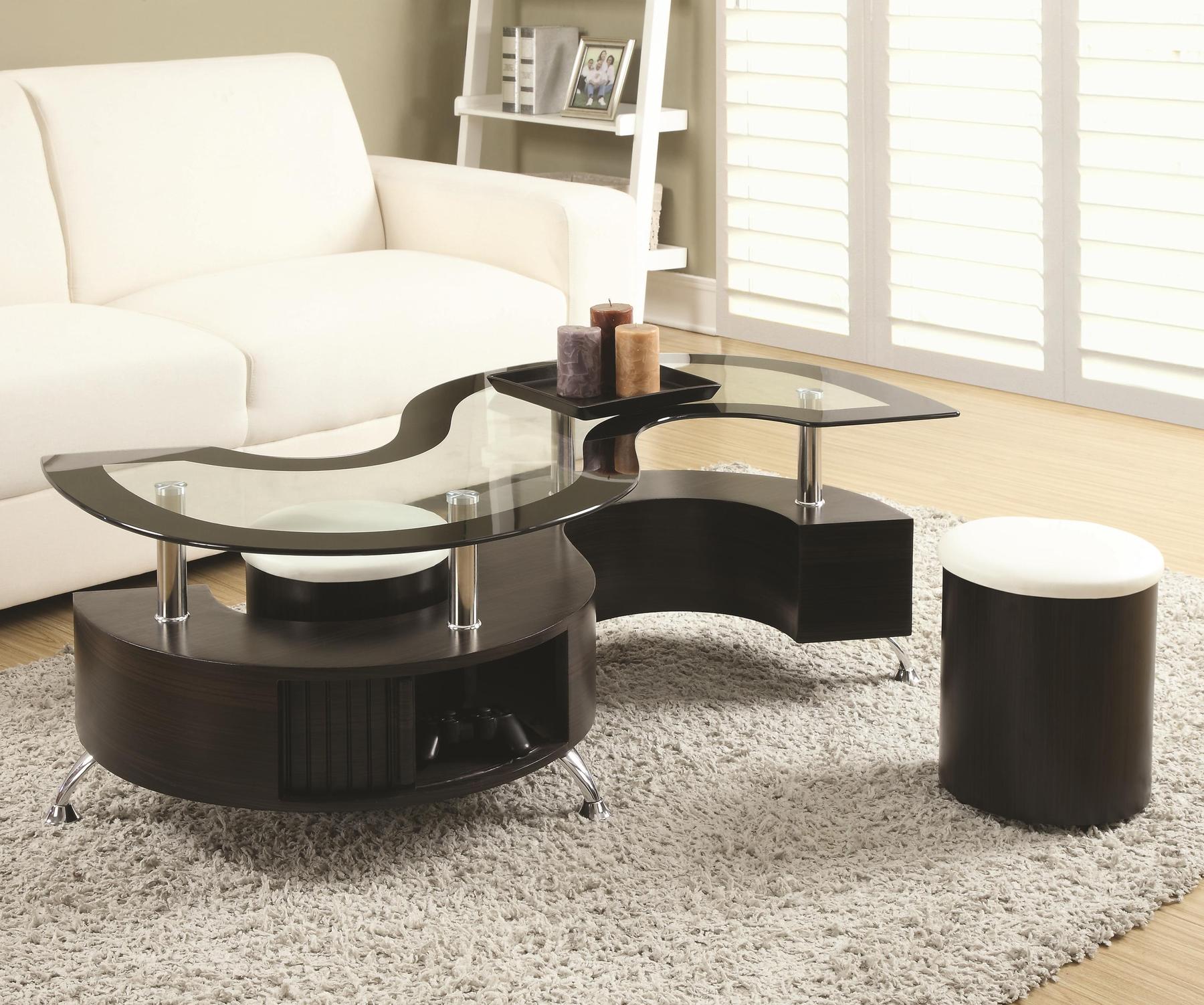 Revel in the contemporary charm of the sinuous curves from this coffee table and stool set. The serpentine silhouette of the occasional table features a glass table top with black edge trim. A sleek cappuccino and chrome finish adorn the base, adding structure to the modern marvel. Including two upholstered stools with storage, this living room set is great for even the smallest of spaces. Shiny and radiant, the thinly arched legs and frame transform any space with style.Features: