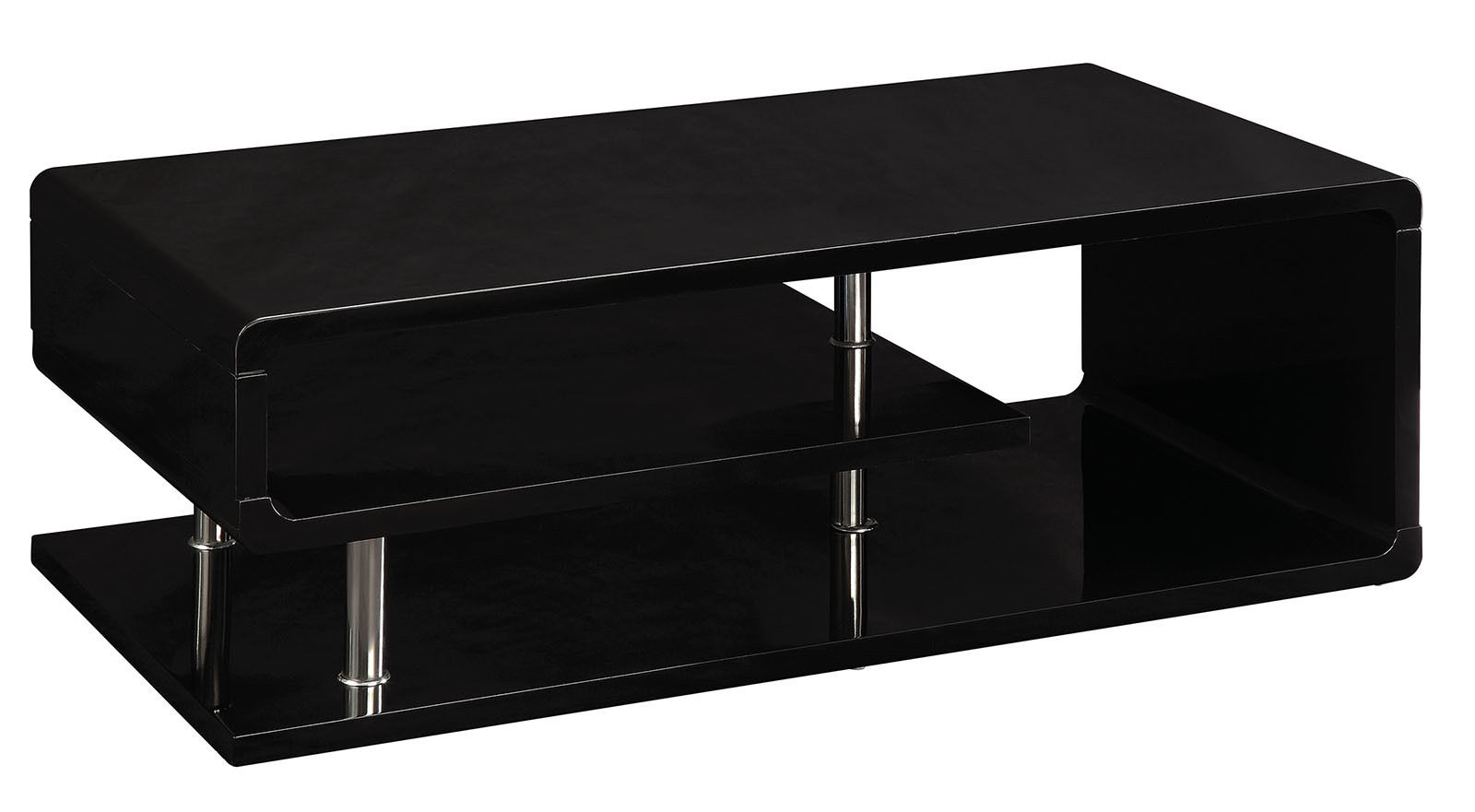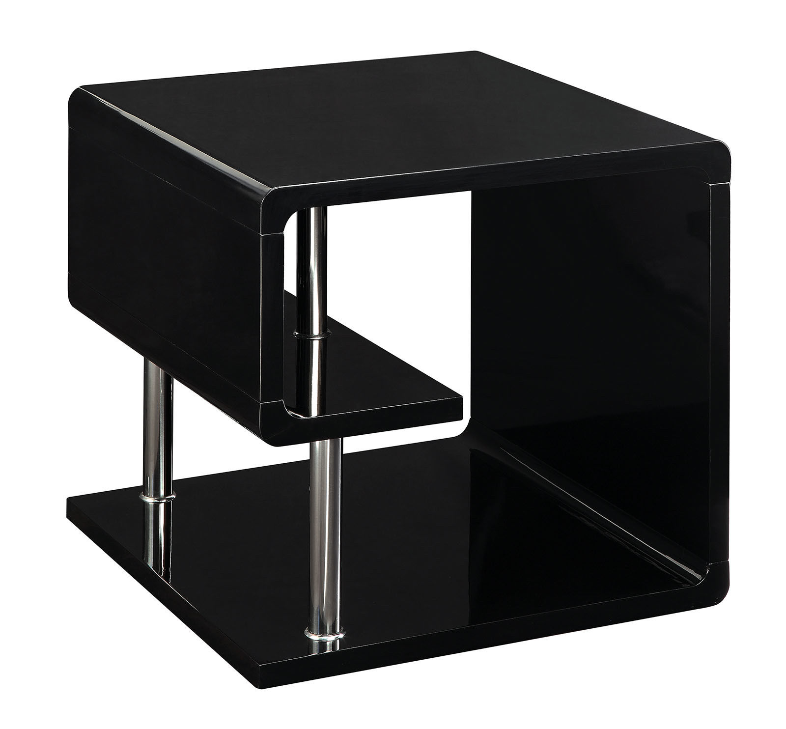 This contemporary set of living room tables has a unique curled shelving design that is supported by sturdy, chrome poles. It comes in black with a high gloss lacquer coating.Features: