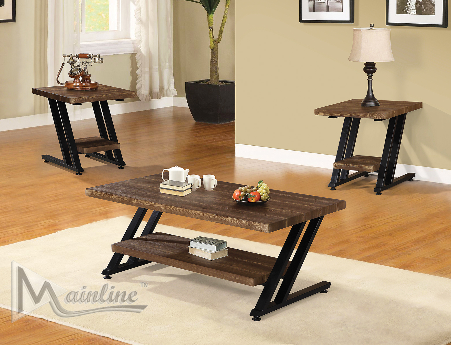 3pcs (1 coffee + 2 end tables set), features driftwood top, steel z-shaped base, wood textured PVC - polyvinyl chloride is 100% artificial leather type that offers extreme value. Very durable, long-lasting and very easy to maintain. ">pvc laminate and shelves. Optional sofa table is available.Model: Zorba