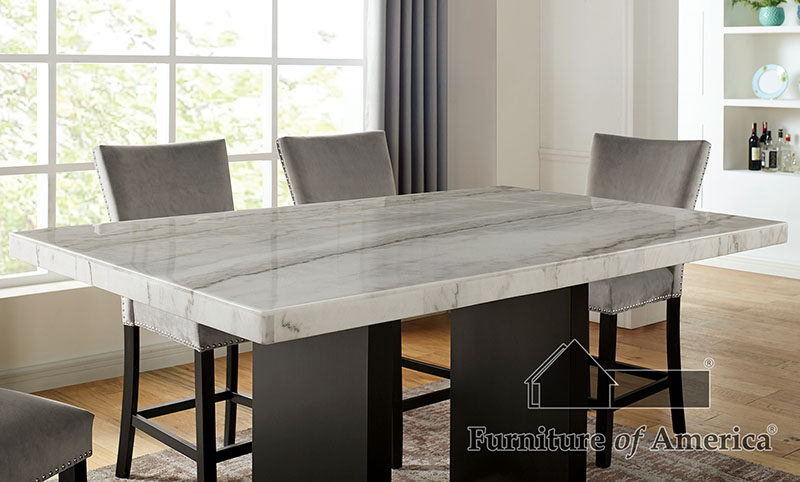 Elevate your dining experience with the sleek Kian Counter-Height Dining Set, a perfect blend of contemporary design and timeless elegance. At the heart of this collection is a stunning, genuine marble tabletop that exudes luxury, resting effortlessly upon a finely crafted dark veneer base. The Kian set exemplifies transitional style, effortlessly bridging classic and modern aesthetics to create a sophisticated focal point in your dining area.Each chair is upholstered in sumptuous padded fabric, ensuring comfort that matches the set's visual appeal. The black and white color scheme is effortlessly chic, adding a touch of class to any interior design. Solid wood construction provides the foundation for durability and strength, while wood veneer and other high-quality materials ensure a lasting beauty that will impress for years to come.