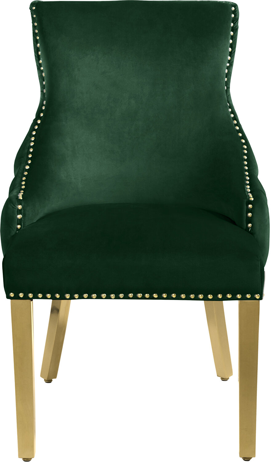 These affordable dining chairs are sold as pairs and feature few colors in velvet (shown here in green), golden legs and golden nailheads. Would look absolutely gorgeous with almost any dining table.Features: