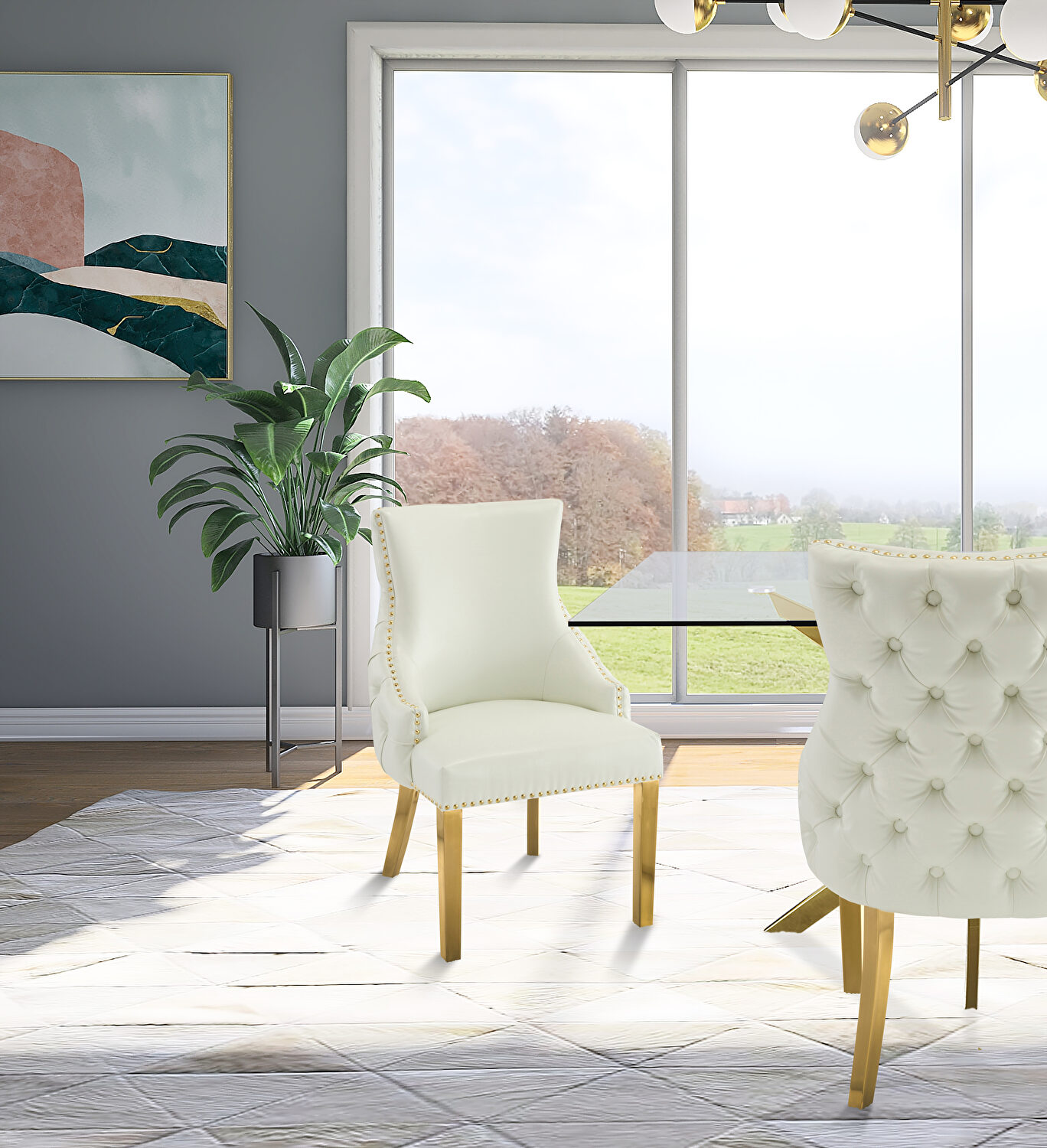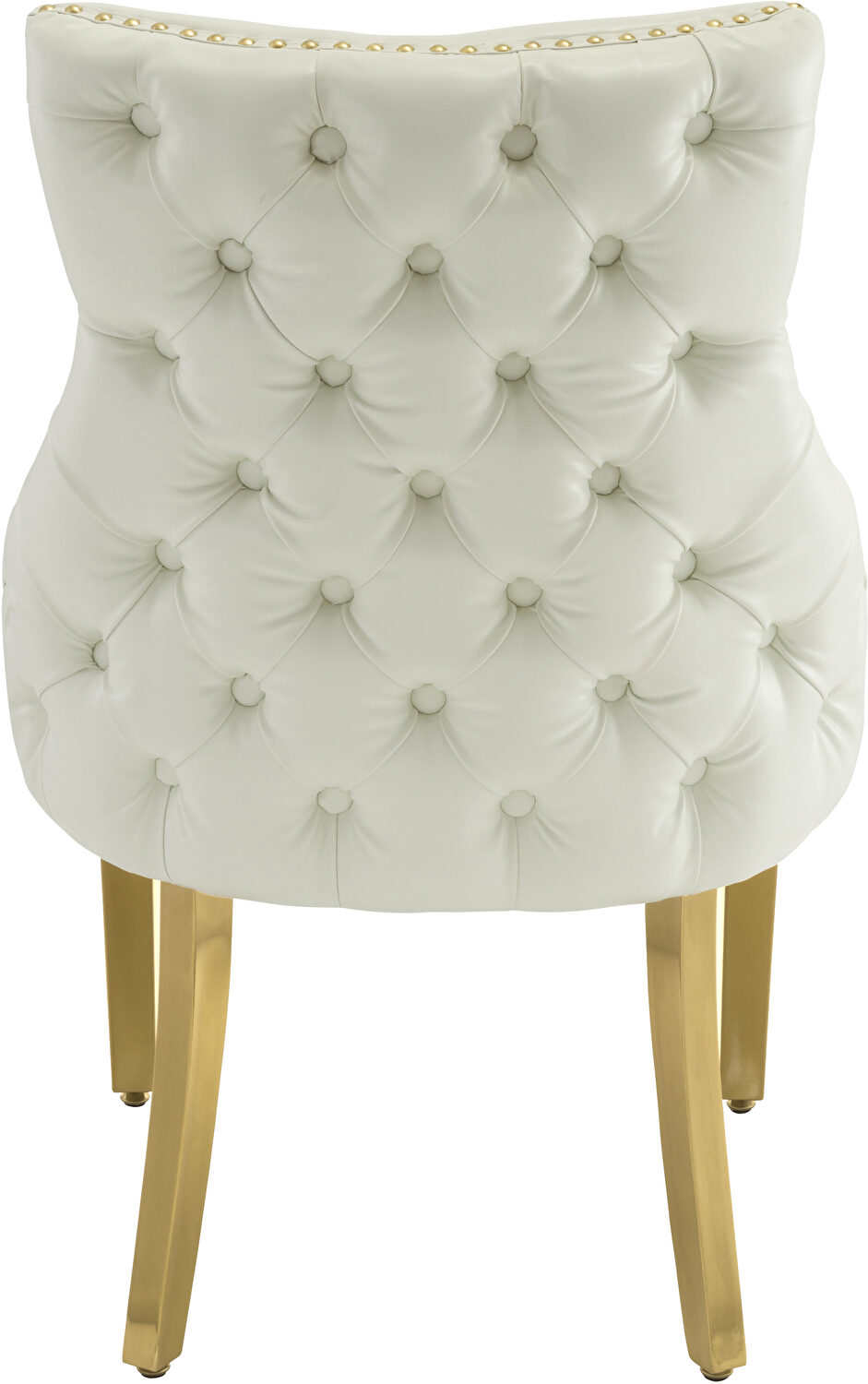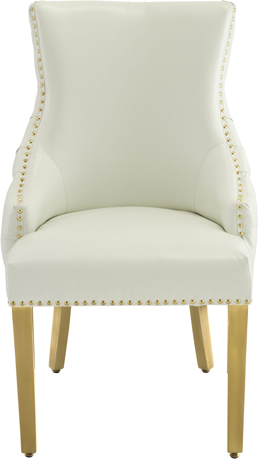 These affordable dining chairs are sold as pairs and feature few colors in faux leather (shown here in white), golden legs and golden nailheads. Would look absolutely gorgeous with almost any dining table.Features: