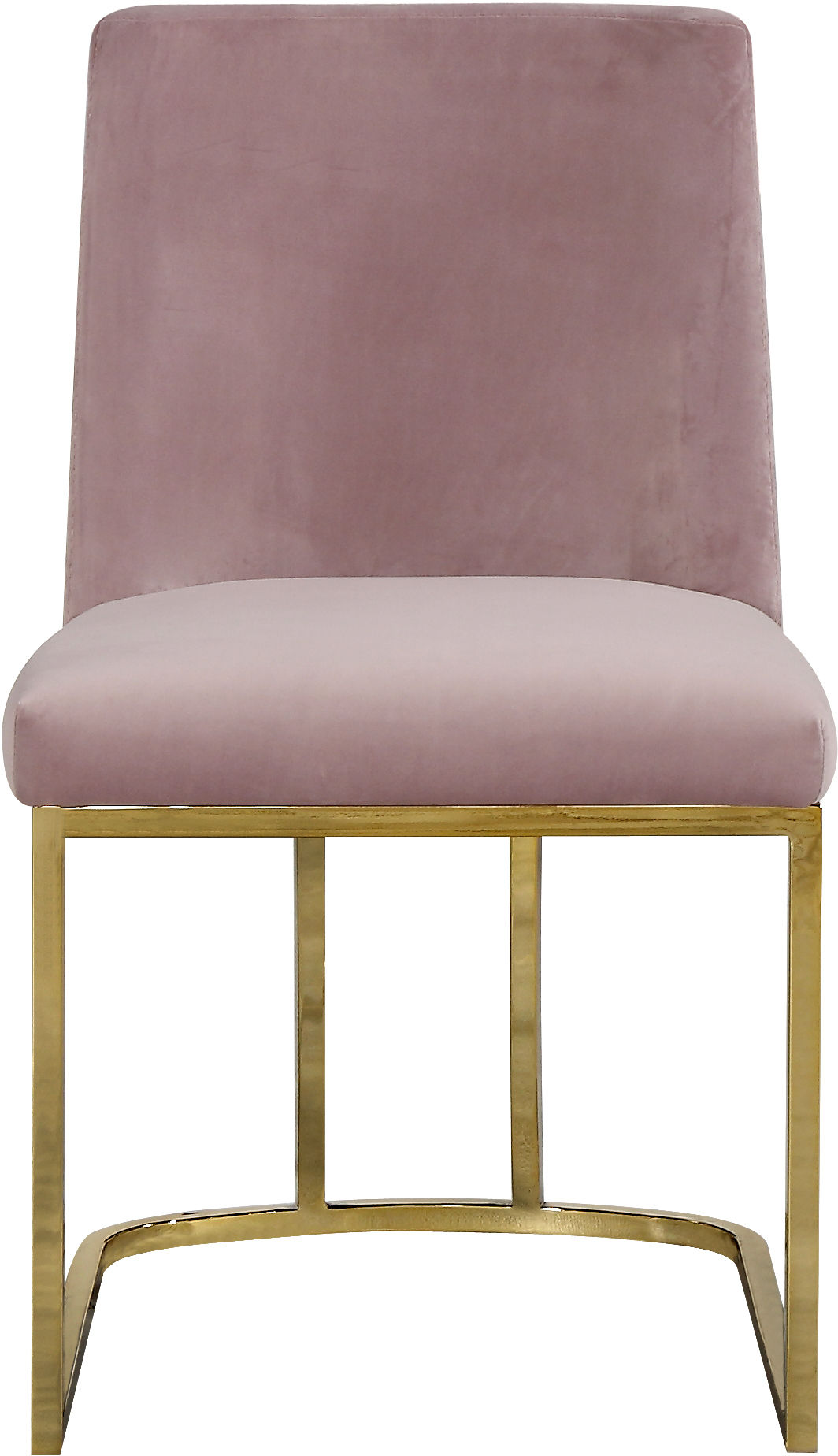 Lend your dining room a Hollywood-inspired vibe with this chic Heidi Pink Velvet Dining Chair. This pretty chair features velvety smooth upholstery on its back and seat cushions to comfort and pamper guests while they enjoy their meals. The velvet fabric and gold metal combination ensures that you make a big statement in your space. The metal frame has a polished gold finish that adds to the lavish look of this armless chair. Sold as pair.Features: