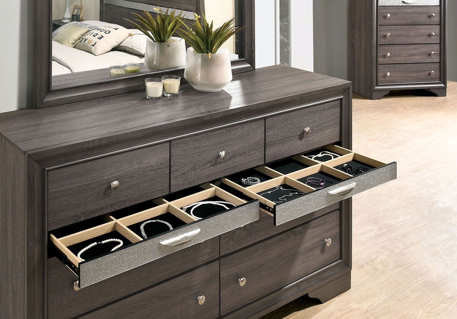 Brighten your room with the sheen and shine that this bedroom set delivers. The gleaming finish promotes a refreshing clean aesthetic with silver lines that glisten. Silver tone pulls detail the case goods brilliantly, offering an easy grasp to the one-of-a-kind jewelry drawers. Glimmering and glamorous, create the room you have always dreamed of with this stunning styled bedroom set.Features: