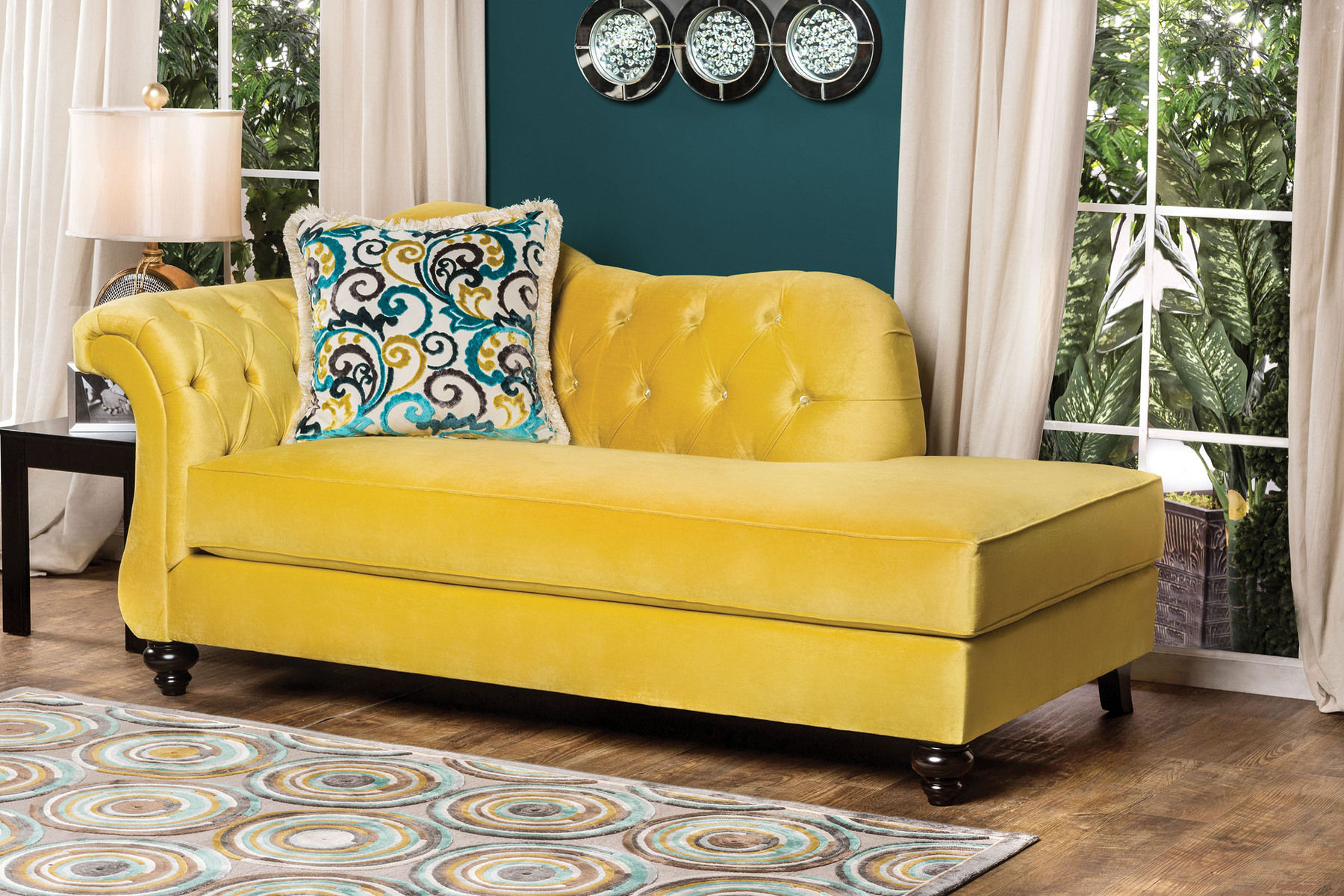 Leave a lasting impression with this timeless reimagining of the chesterfield sofa. Cues from the classic design are kept with essential changes to bring it to the modern day. The reverse camelback seat and arms are deeply tufted with acrylic buttons, and the premium fabric used is in a regal shade of golden royal yellow. Matching pillows with intricate pattern are included. Optional chair, loveseat and chaise are available.Features: