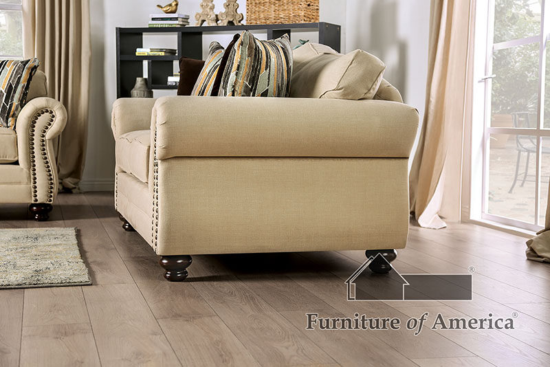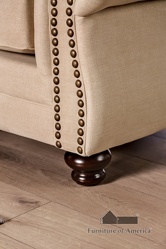 It's sandy-colored elegance with this classic design, a plush American-made tan sofa complete with fancy nailhead trim accents and stained wood double bun legs!Features: