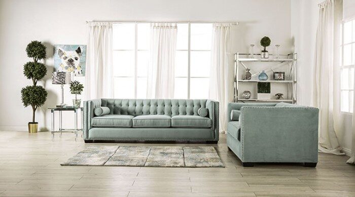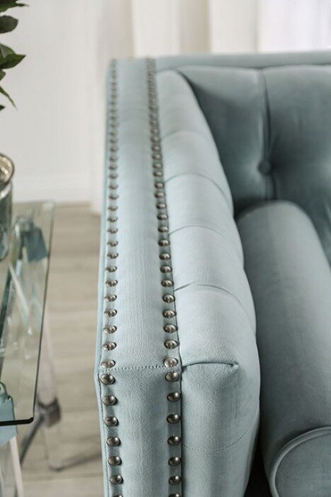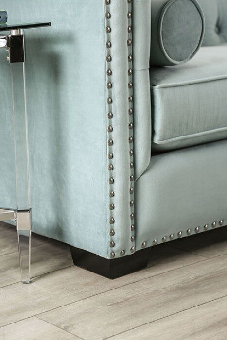 The Elliot collection makes an elegant statement in any living room with its tuxedo style, welted box cushions, button tufting, and nailhead trim. Plush velvet upholstery, bolster pillows, and thick cushions provide all the comfort needed for entertaining. Combine multiples in larger spaces for a stunning set, or use alone in a small space to set a glamorous tone.Features: