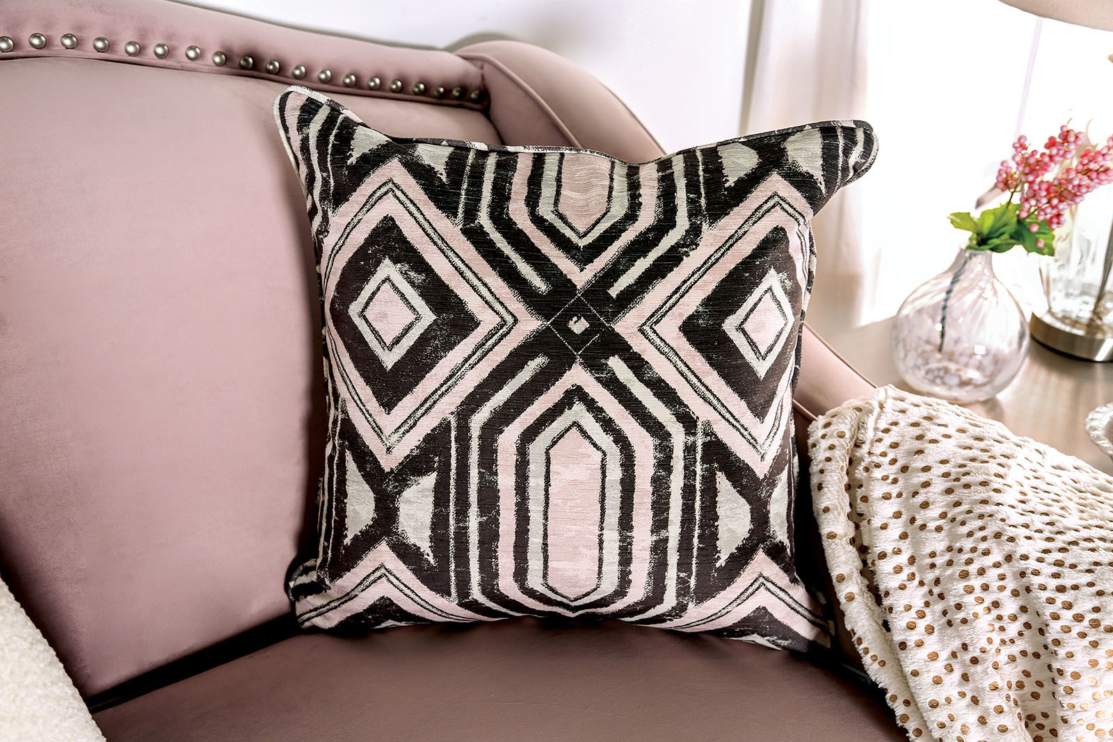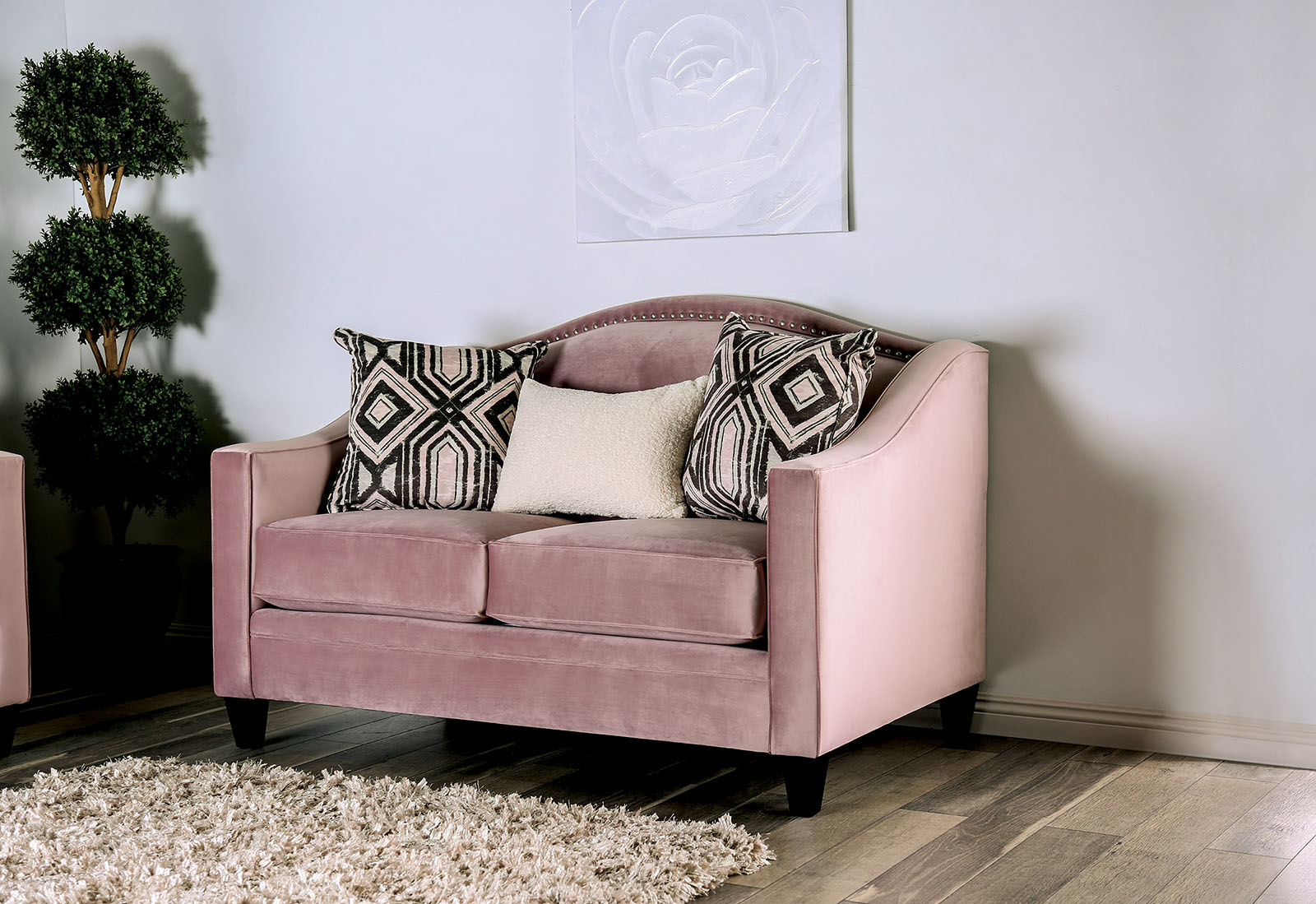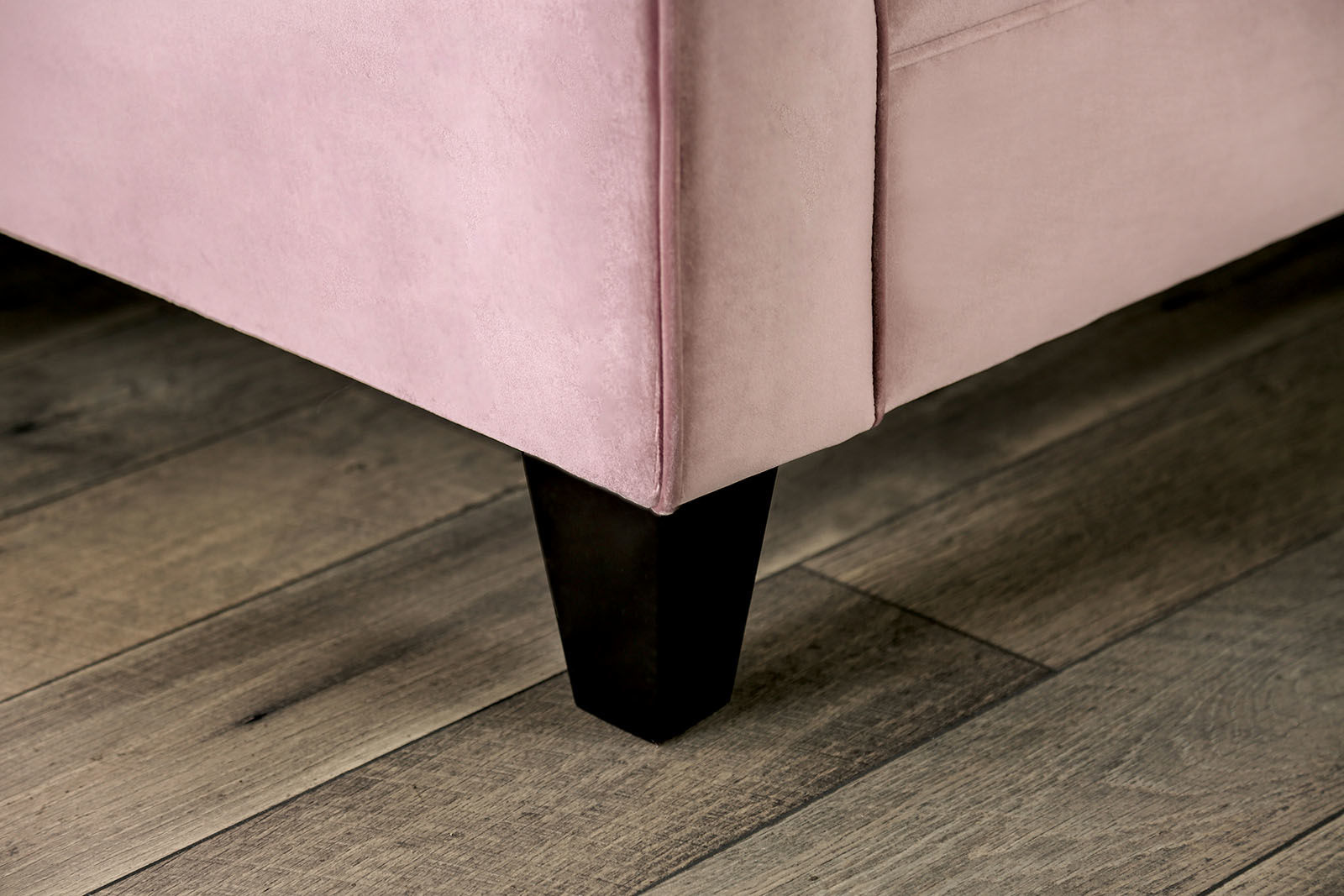discountCampana blush pink velvet like fabric sloped arms sofa