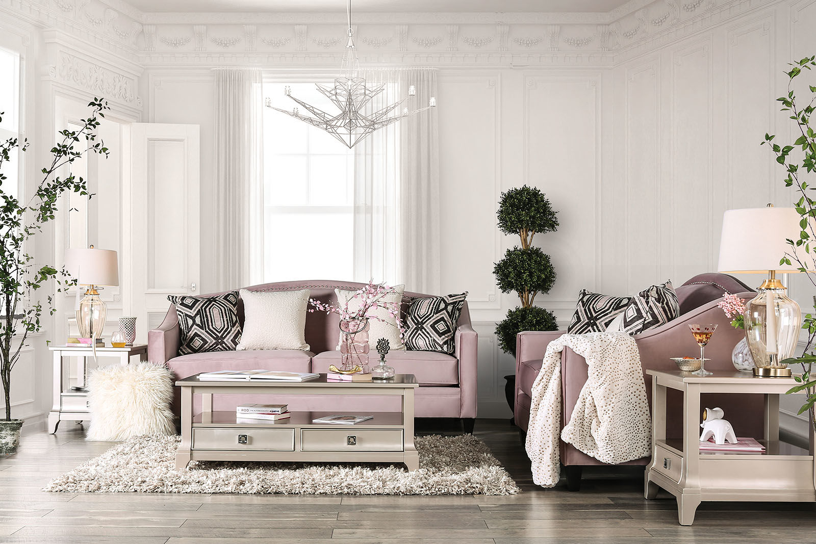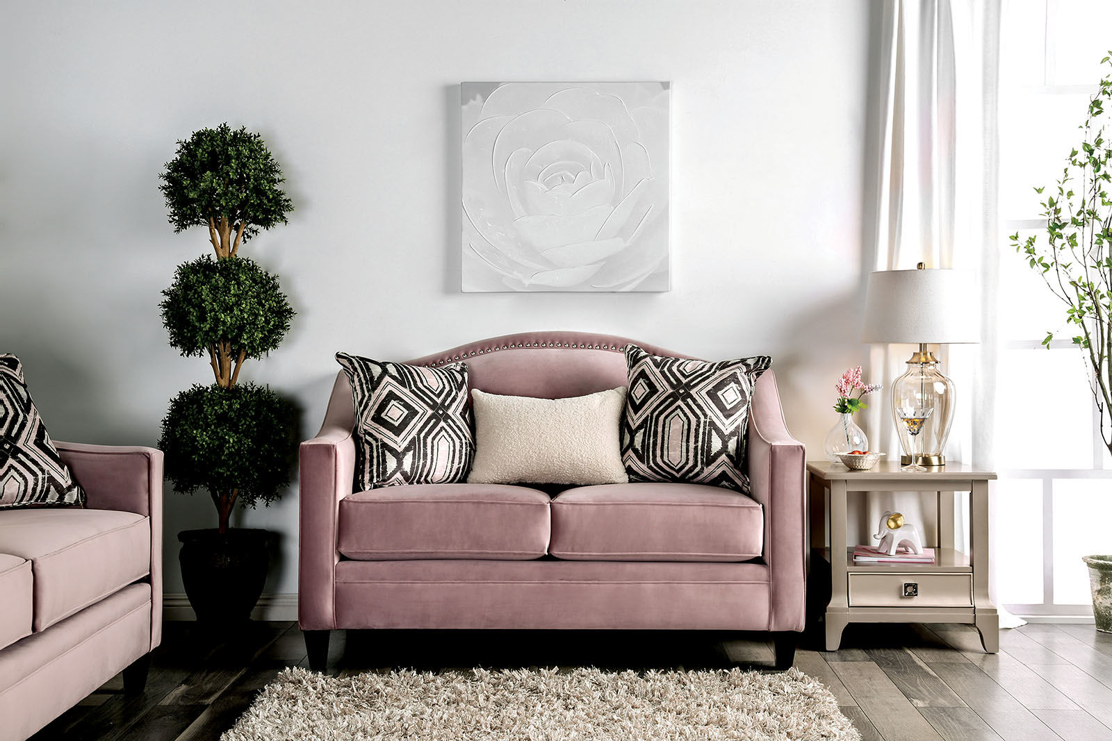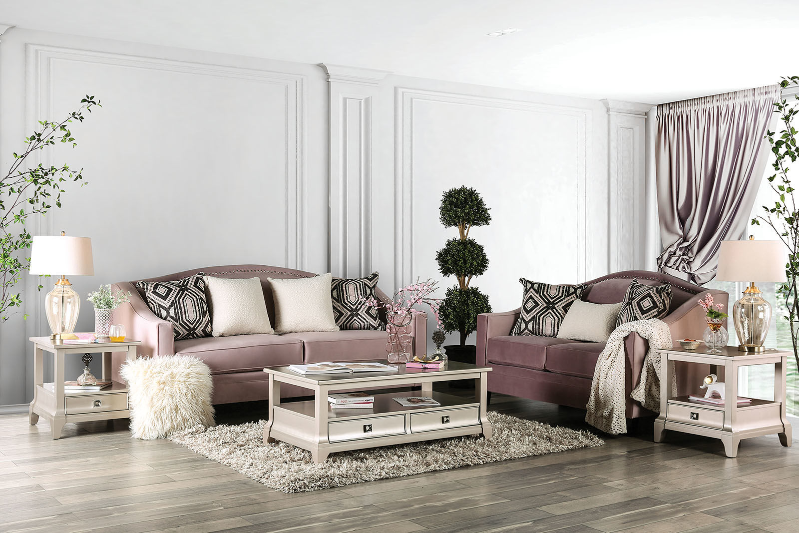 Like an upscale canvas, this neutral colored sofa is the perfect start to a well designed home. A rose tinted fabric covers this delicate camelback shape, the sloping arms offer a natural rest for your arms, and decorative throw pillows match the posh nature of the set. The delicate tones set up your room for more accent pieces.Features: