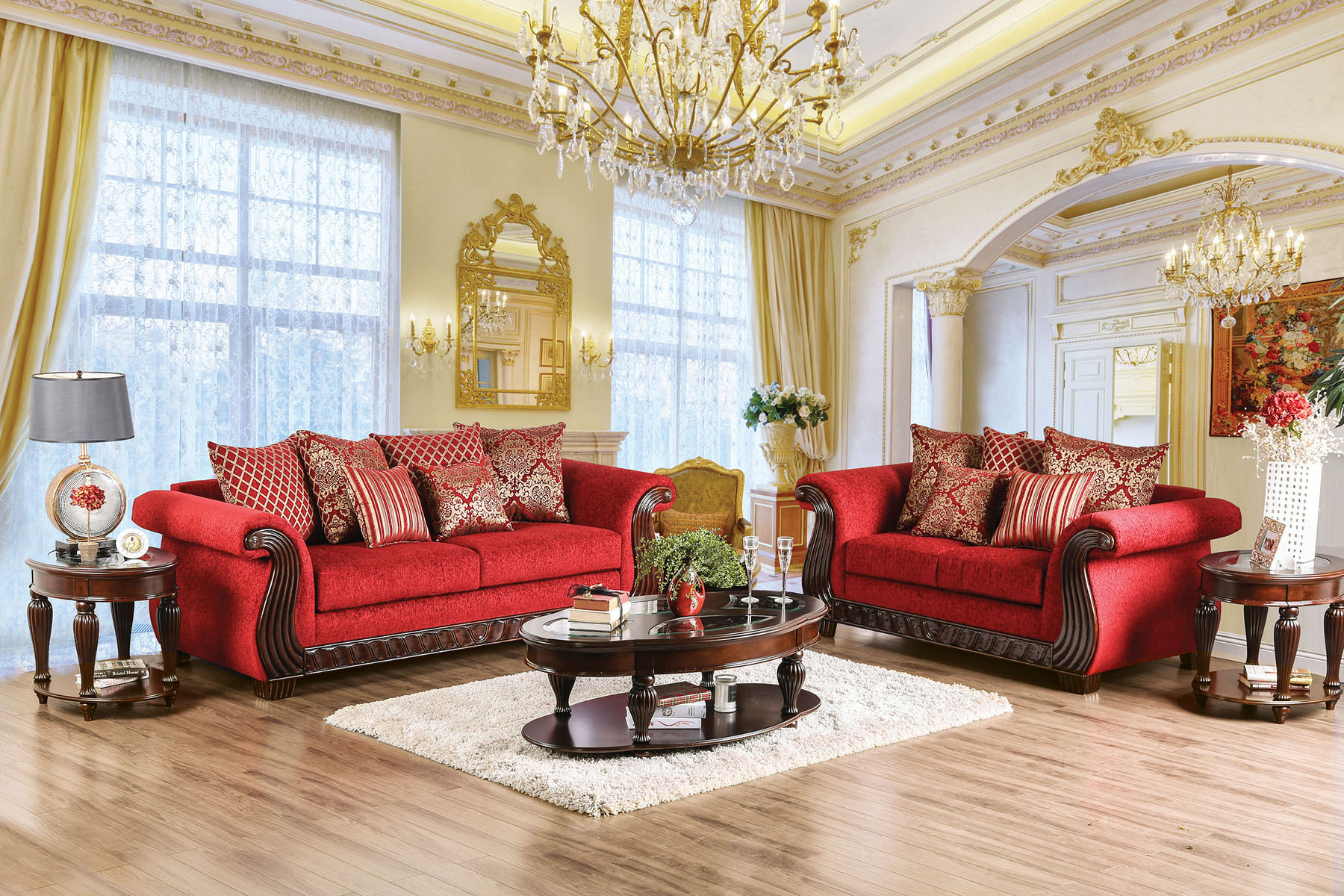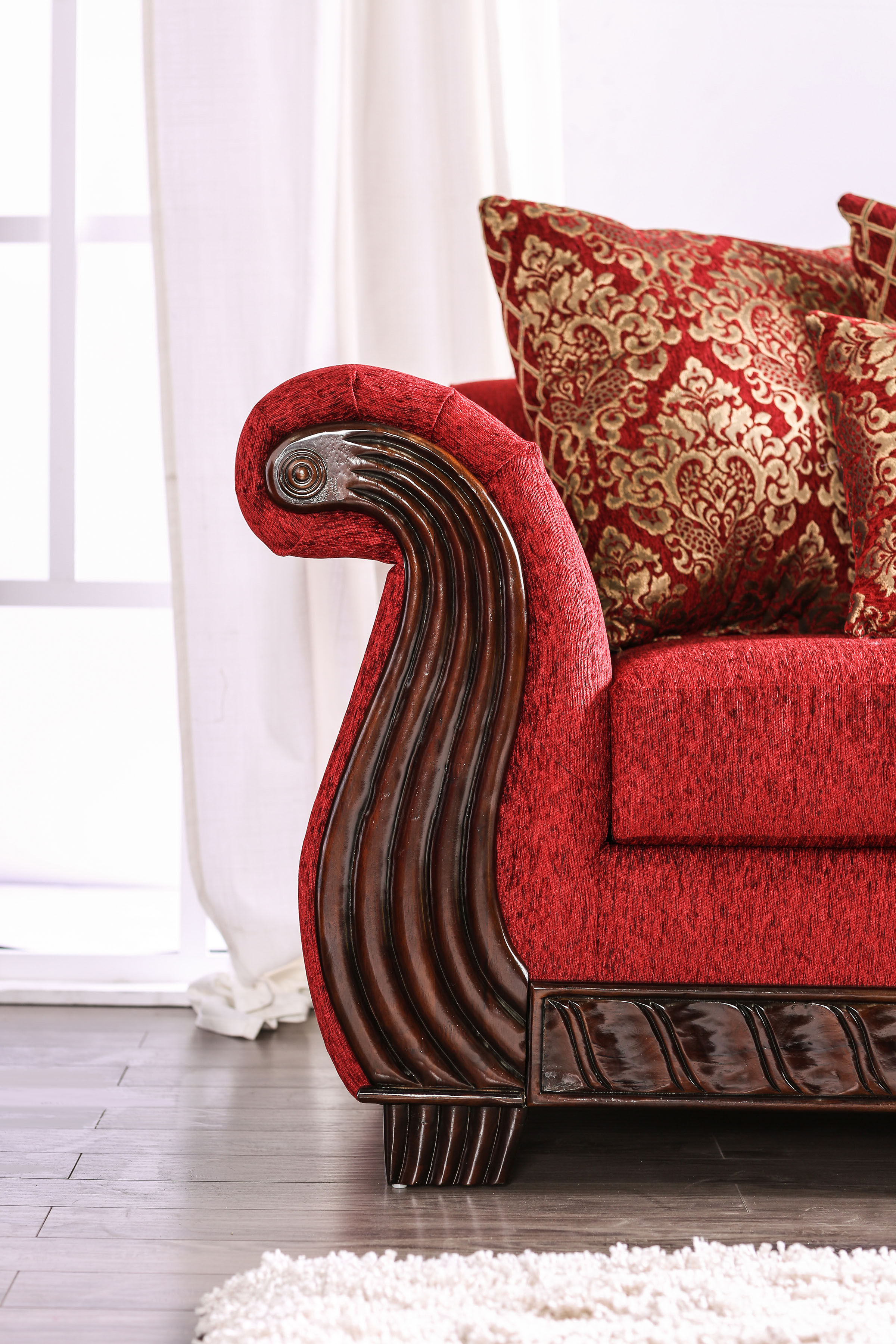 The low back of this traditional style red sofa creates an air of elegance to make even the most basic space a place of refined sophistication. The plush chenille upholstery gets a dramatic twist with ornately designed accent pillows adding extreme comfort and over-the-top style. For warmth and charm, the rolled arms are trimmed with intricately carved wood for an absolutely stunning touch.Features: