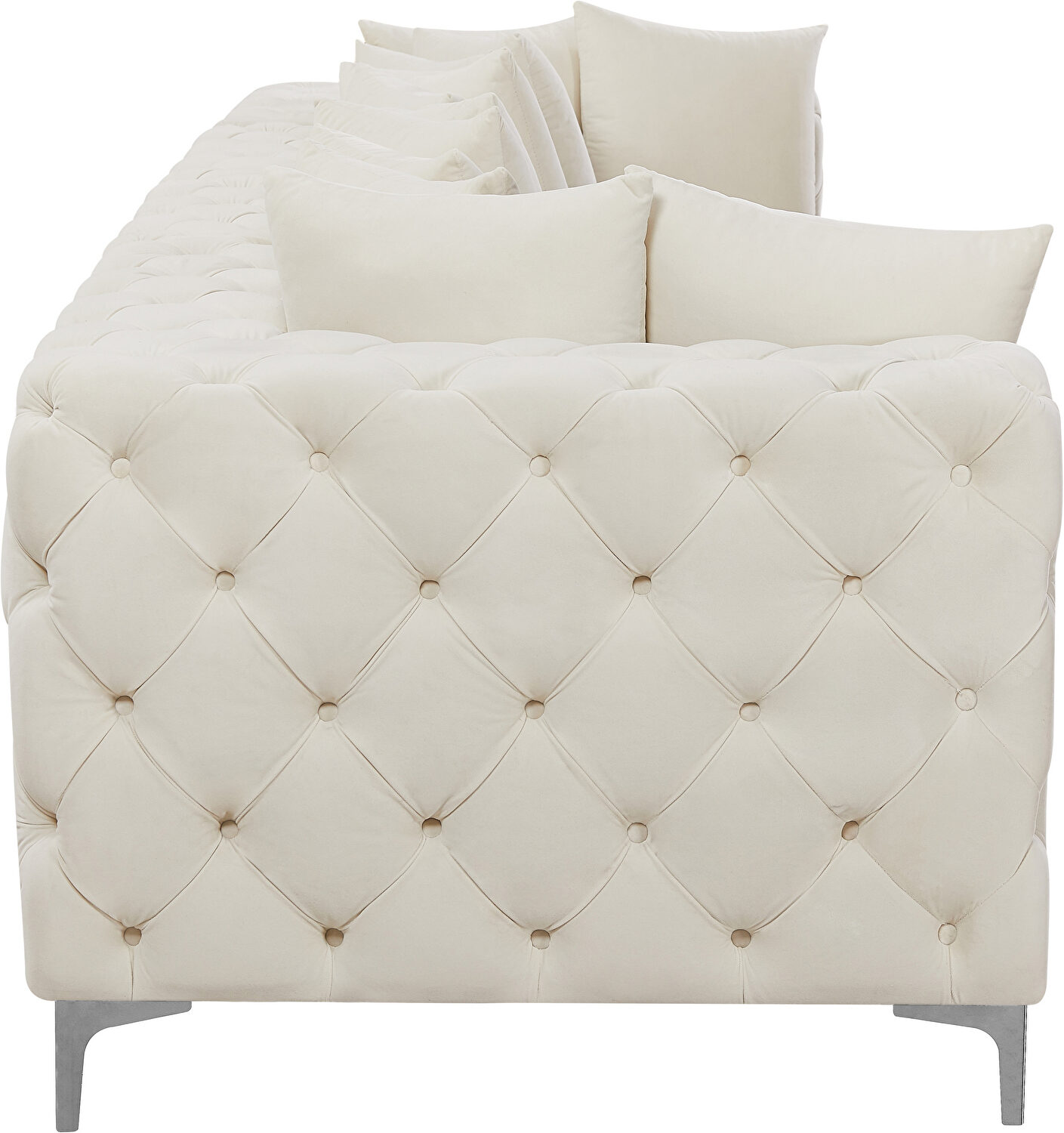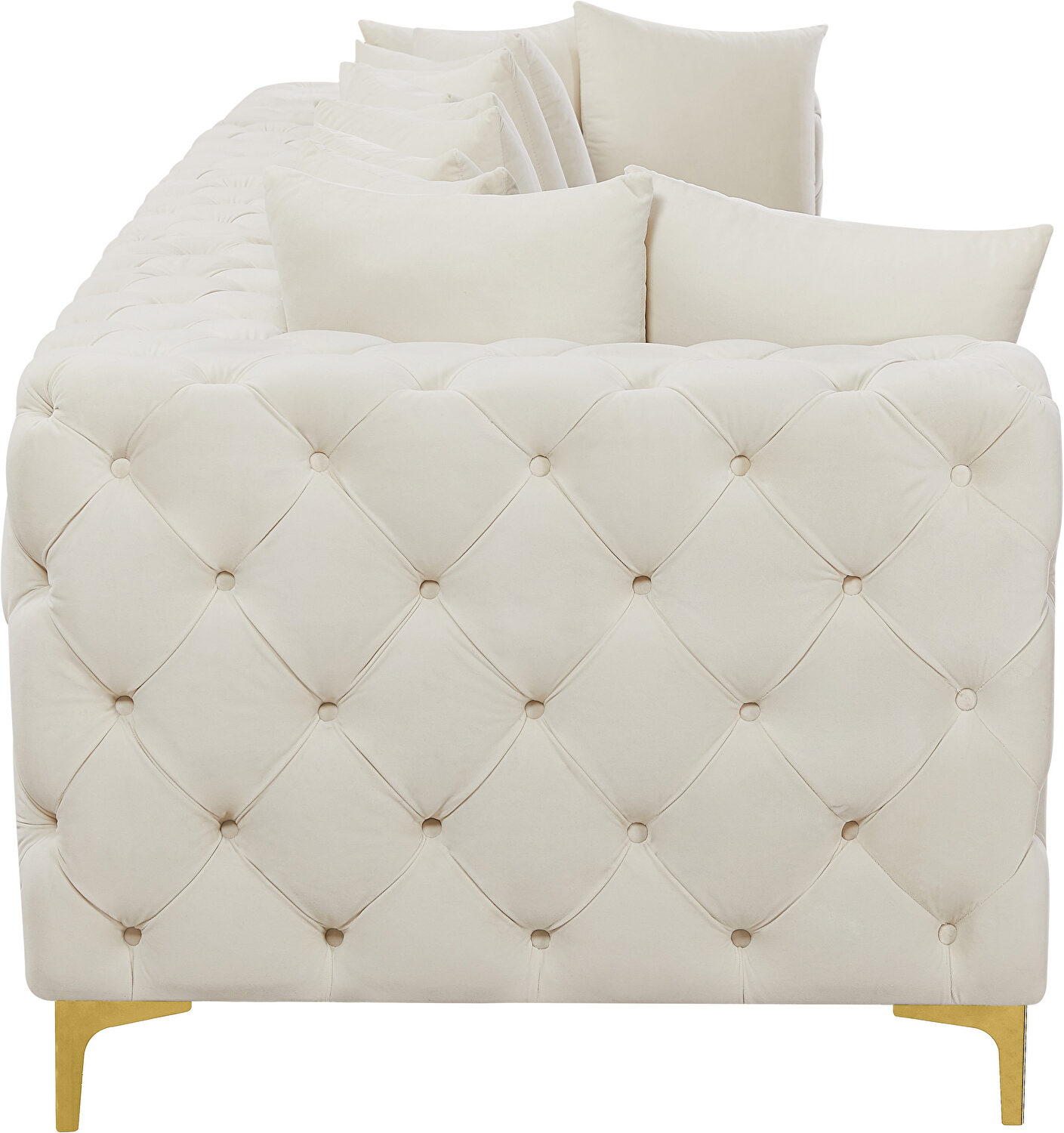Sink into the luxurious embrace of the Tremblay 4pcs modular sofa, where comfort meets contemporary elegance. Draped in sumptuous cream velvet, this sofa's plush upholstery invites you to unwind in style. Its striking deep button tufting delivers a classic aesthetic with a modern twist, ensuring your living space makes a statement. Versatility is at the heart of the Tremblay's design; it comes with both gold and chrome legs, allowing you to customize its look to seamlessly blend with your existing decor. Furthermore, this sofa's modular nature offers endless possibilities for configuration, adapting effortlessly to your spatial needs and design ambitions. Assembly is a breeze, thanks to a simple latch mechanism located beneath the frame. Whether you're hosting a movie night or lounging with a good book, the Tremblay sofa is the perfect foundation for your modern living area.Features: