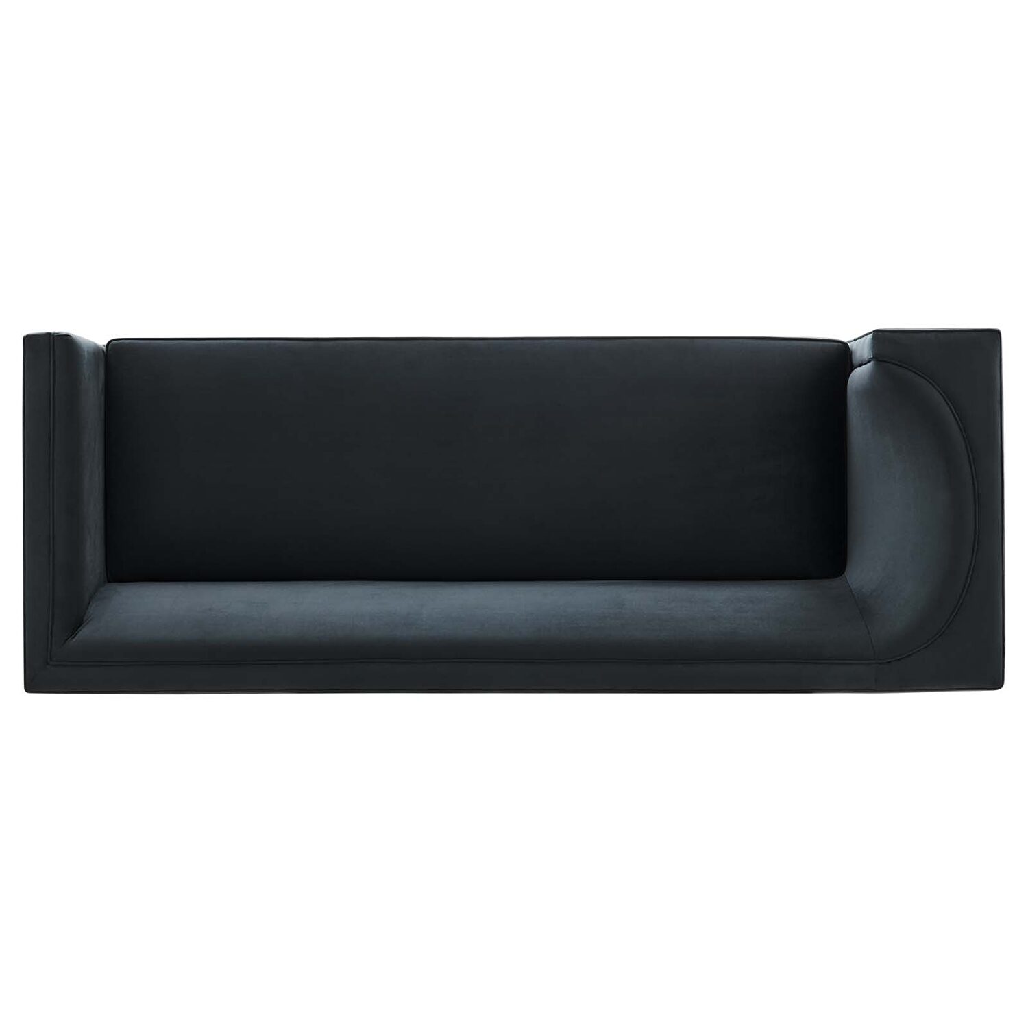 Elevate your home's aesthetic with the Eminence Performance Velvet Sofa, a statement piece that seamlessly blends sophistication with a touch of whimsy. Crafted to perfection, this black velvet sofa is a masterpiece that suits a variety of interior themes, from the clean lines of mid-century modern to the bold flair of contemporary spaces, and even the diverse textures of eclectic styles.The Eminence Sofa's distinctive shape is sure to draw the eye, featuring a unique, asymmetrical armrest design that infuses your space with character and charm. The sofa sits gracefully atop a lustrous gold inset rim, adding a dash of opulence to its overall look.