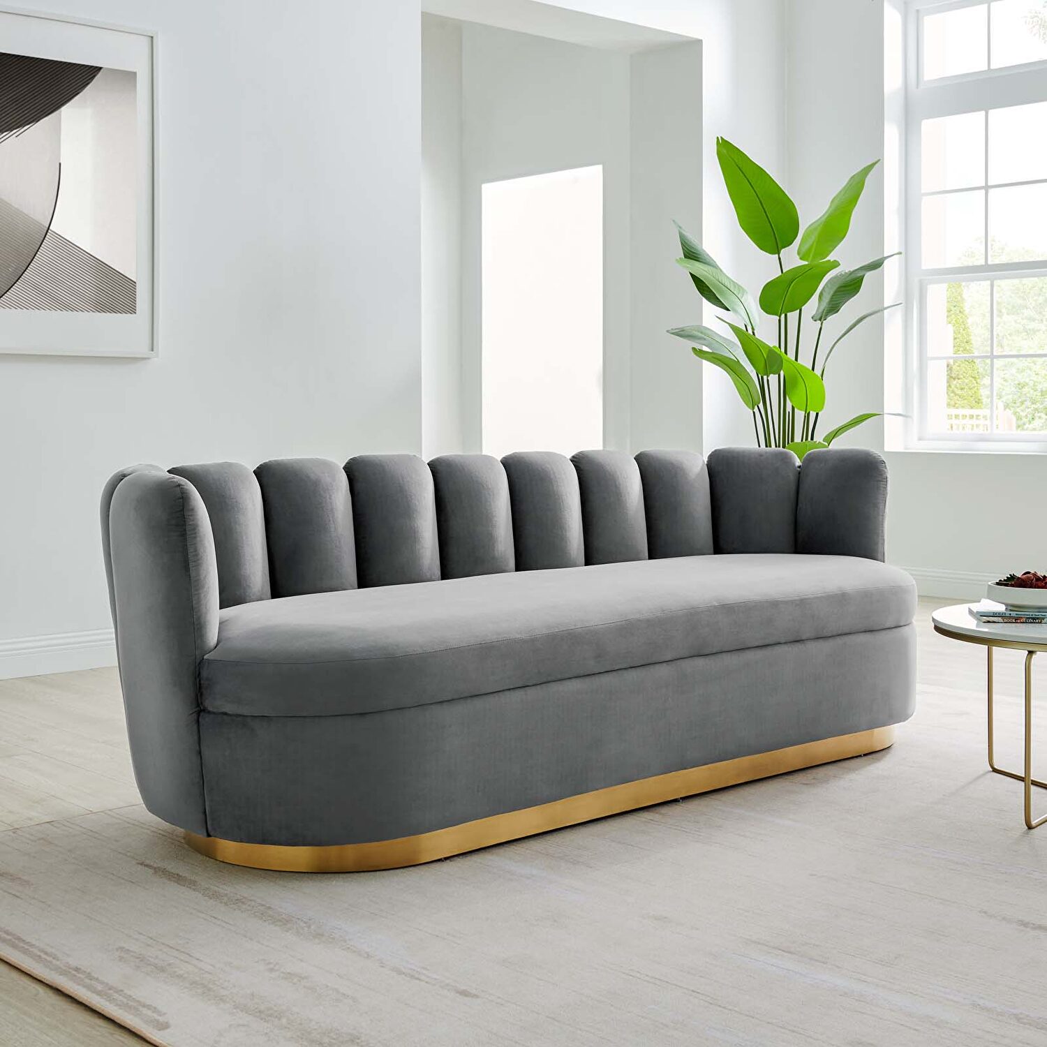 Welcome your guests in the lap of luxury with our Victoria Modern Gray Sofa, a centerpiece that radiates elegance and contemporary charm. Designed to provide an inviting atmosphere to your living area or lounge space, this sofa boasts a sleek profile accented by eye-catching channel tufting, adding a dynamic and vibrant flair to your home decor.Enveloped in a plush, gray performance velvet, this stunning sofa is not only visually captivating but also practical, offering stain resistance for a worry-free, easy-to-maintain surface. The robust wood frame ensures durability, while the high-density foam cushions deliver an exceptionally comfortable seating experience that invites relaxation and conversation.