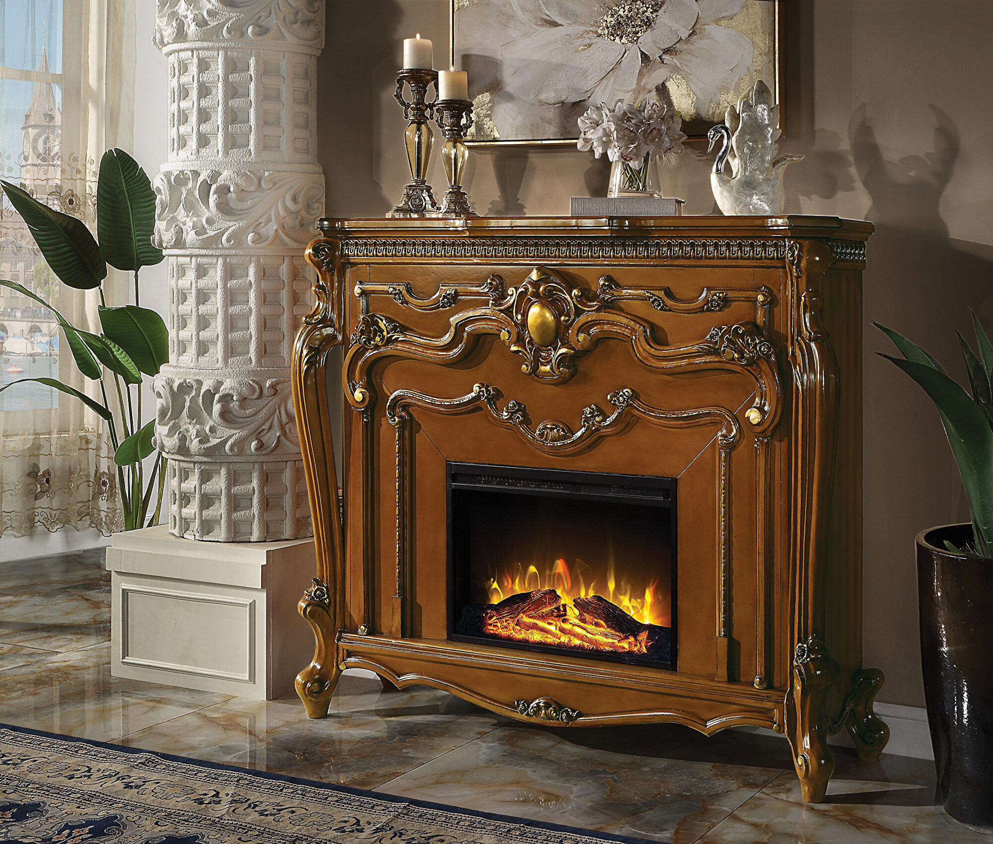 Add a focal piece into any room with the ornate Picardy fireplace in a honey oak finish. The elaborate details of the mantel include winding carvings, medallion, and carved trim on top. The overall look is impressively beautiful and creates a timeless centerpiece for your home. The fireplace features glowing embers and carved logs and features various brightness and speed settings. The unit is also operable independent of the heat for true year-round enjoyment. A multi-function remote control is included and allows you to turn the unit on/off and set the timer.Features: