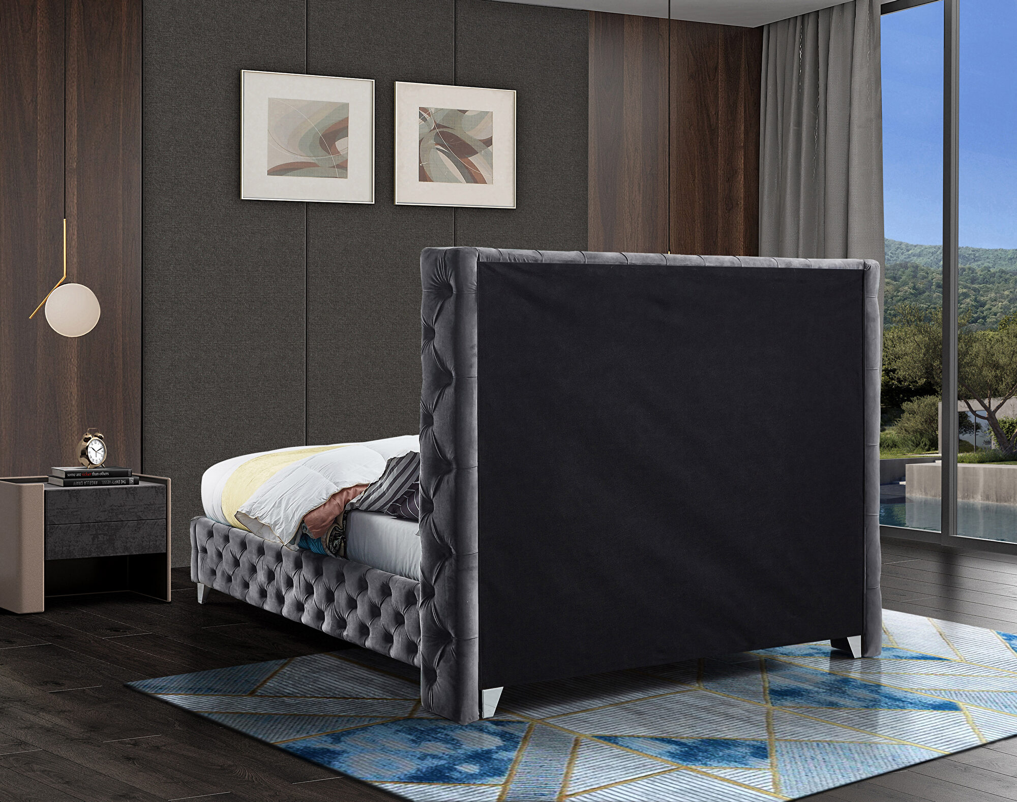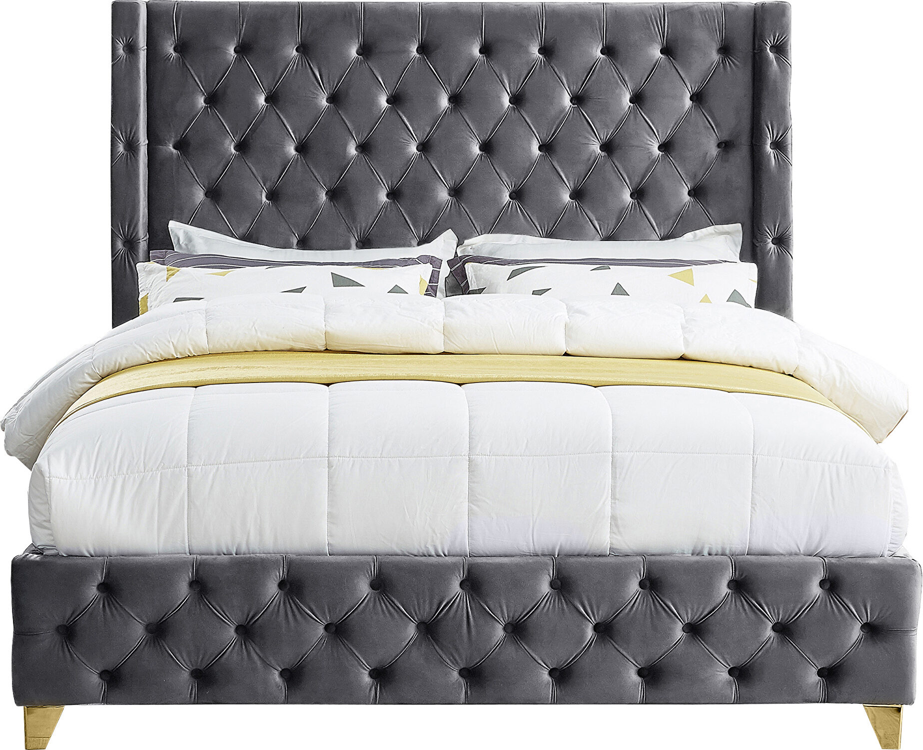 Elevate your bedroom into a realm of sophistication and elegance with the Savan velvet full size bed. This exquisite piece is the epitome of luxury, swathed in the sumptuous texture of premium gray velvet. From the imposing height of its magnificent headboard to the chic silhouette of its footboard, every detail is meticulously crafted. The deep button tufting creates a timeless allure, while the contemporary wingback design adds a touch of modern flair, ensuring your bedroom becomes a showcase of style and comfort.One of the most captivating features of this bed is its versatility in personalization. It comes equipped with two distinct sets of legs, one in a polished gold finish and the other in a sleek chrome, giving you the freedom to tailor the look to match your decor whims. Whether you're aiming for a bold statement or a subtle hint of opulence, the choice is yours.