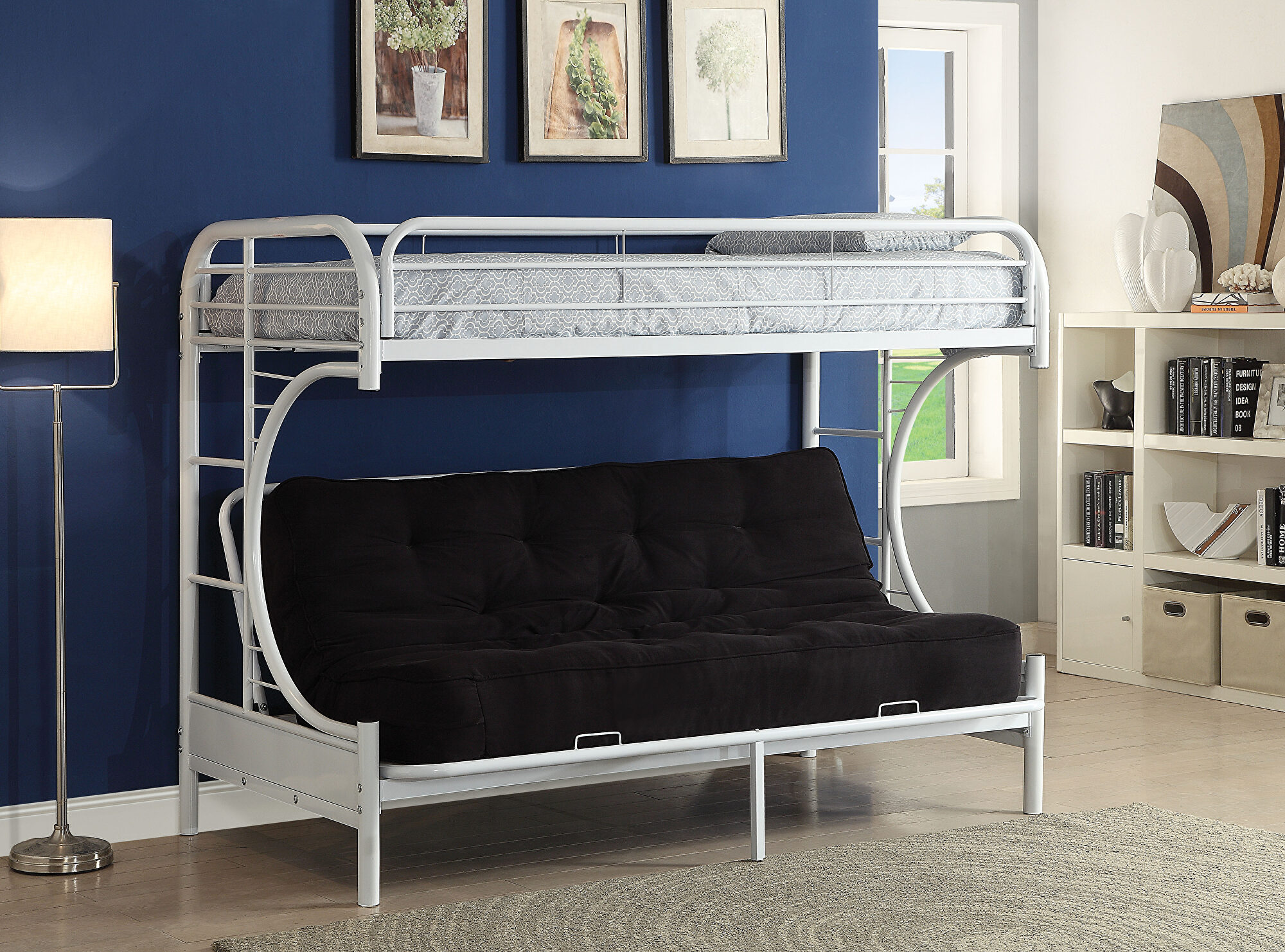 Bring home this Eclipse twin XL over queen-futon bunk bed to let your kids enjoy personal space without compromising on style. The convertible futon feature allows to switch from a sit to sleep position by simply lifting the light weight of the seat; a quick and easy transformation into a ready to use bed. Superior quality metal for durability, built-in side ladders for easy access, and full length guard rails for safety. Choose from a variety of colors, makes it compatible with all types of decor settings. Mattress Not Included.Features:
