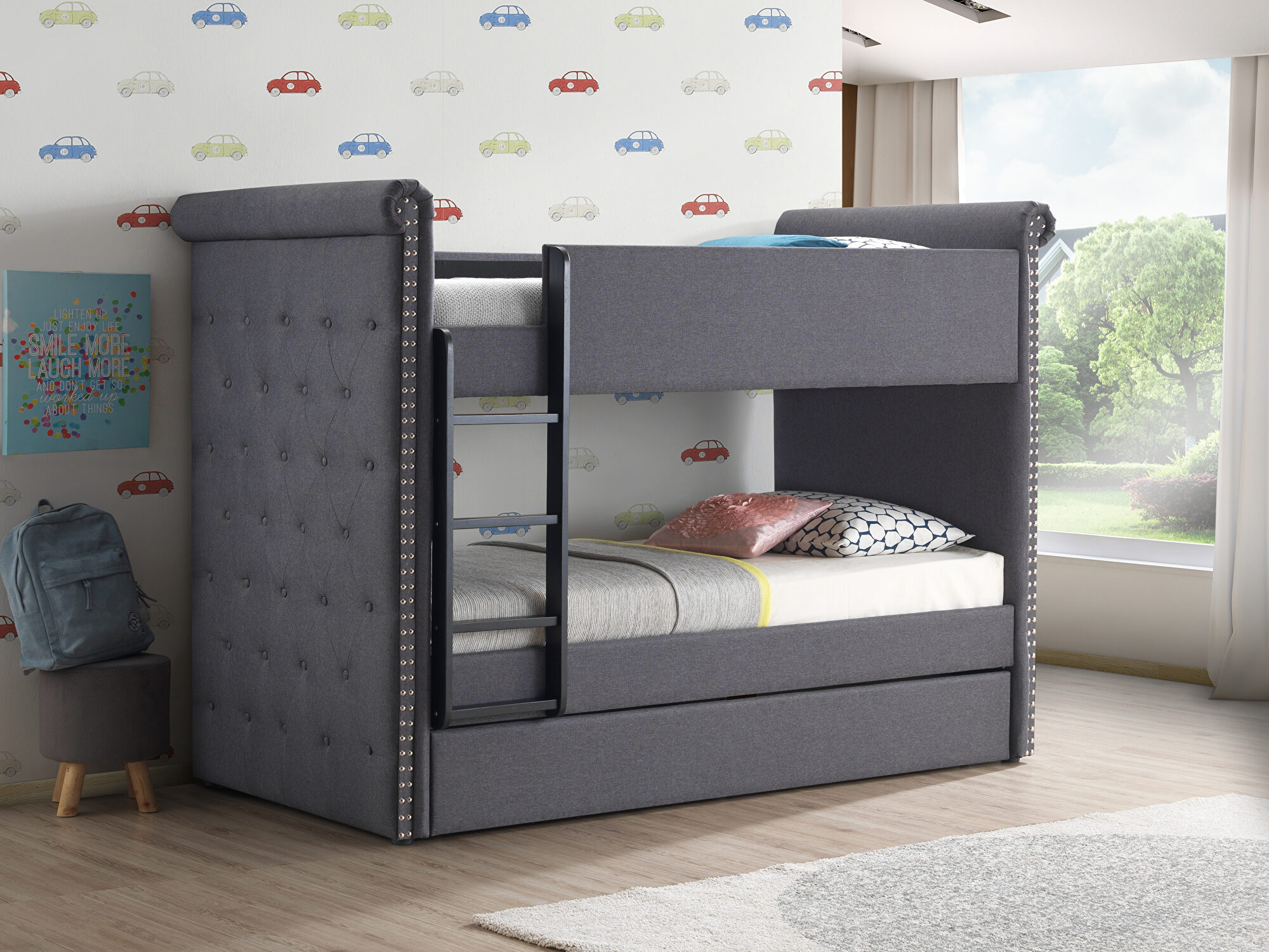 Give your child's bedroom a convenient and stylish update with the Ramona II twin over twin bunk bed. This bed's unique gray fabric has antique-inspired details like button tuft upholstery, and nailhead trim to create a charming and timeless look. A twin-sized trundle with casters for mobility offers room for an overnight guest. Your children will enjoy this beautiful and functional bunk bed in your home.Features:
