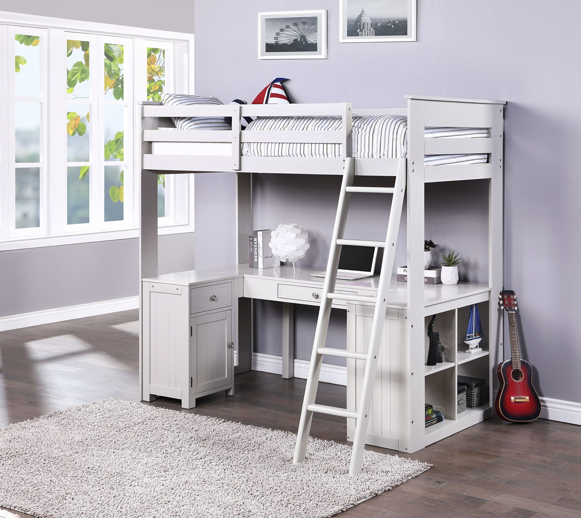 The Ambar loft bed is a wonderful multi-function piece that will grow with your child. The timeless light gray finish and clean lines allow this bed to work with any decor style. Included with this loft bed are a desk with drawer, and a bookcase and chest to provide plenty of storage. The right-facing front ladder is conveniently positioned without blocking access to the extended work surface created by the desk and bookcase. The versatile Ambar loft bed is a fantastic piece you'll enjoy for years!Features: