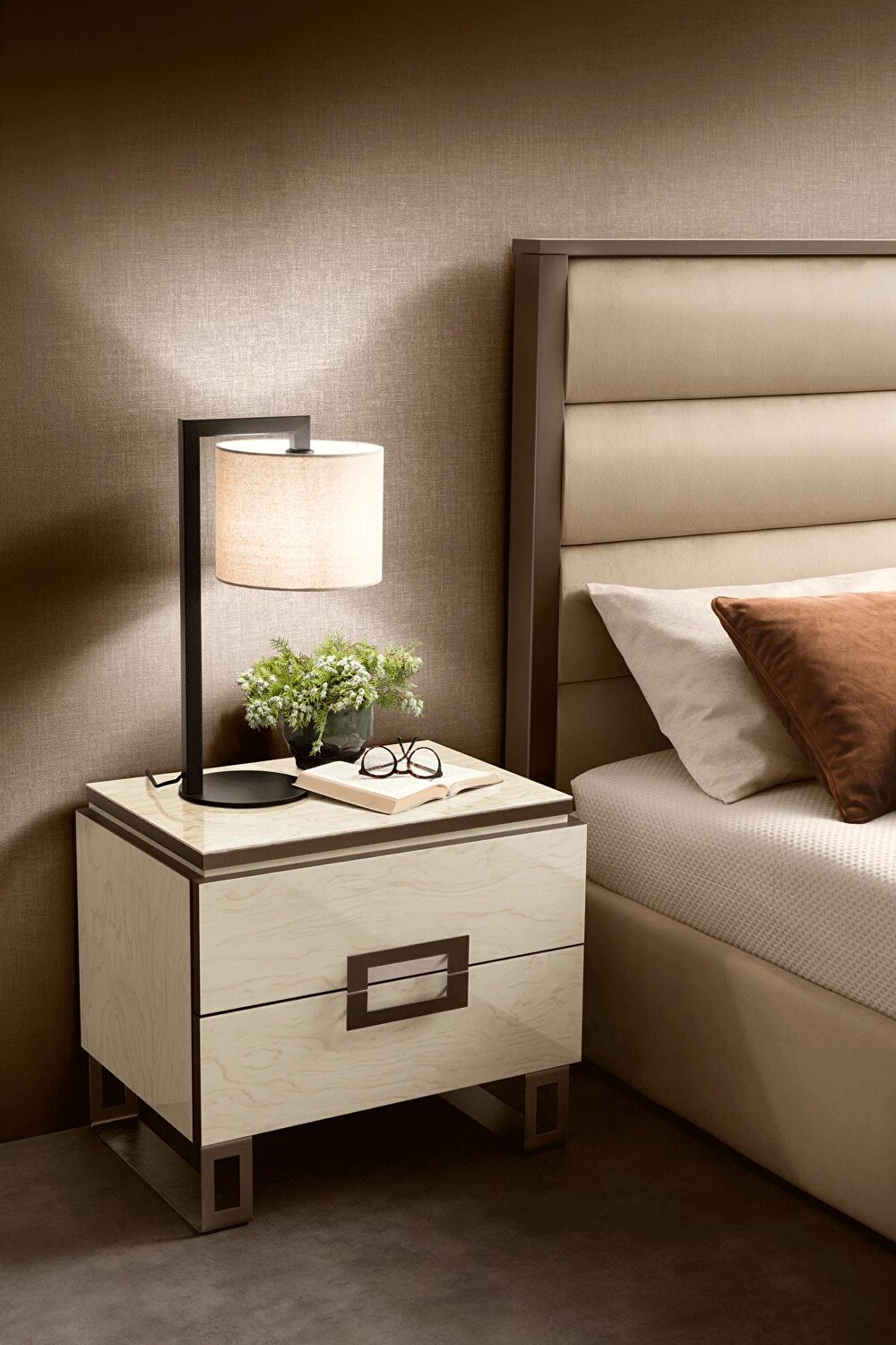 Poesia king size bed bears the signature of the Adora brand and is composed of complements designed to furnish the bedroom. A refined collection in which every piece of furniture is a metaphor for Made-in-Italy beauty and elegance. Minimalist details meet sophisticated materials in a fusion of refined character.The Poesia bedroom provides intimacy and total comfort, in several variations. Double beds are available with wooden headboard or with upholstered headboard and LED light incorporated along the upper frame in both solutions.