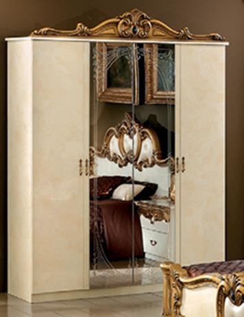 This traditional Barocco style king size bedroom set in ivory/gold rich finish consists of queen size leather panel bed, 2 nightstands, double dresser and a matching mirror. Priced for queen bed initally, add other pieces using options. Available in few finishes these items will provide all of your bedroom furniture needs. Straight panels are in chipboard, then veneered (veneer being a thin layer of solid wood); then the veneers are lacquered using a 6 steps/layers of UV high gloss polyester lacquer. Manufactured according to European and international standards. Camelgroup Italy. Platform for all beds is optional.Model: Barocco Ivory/Gold