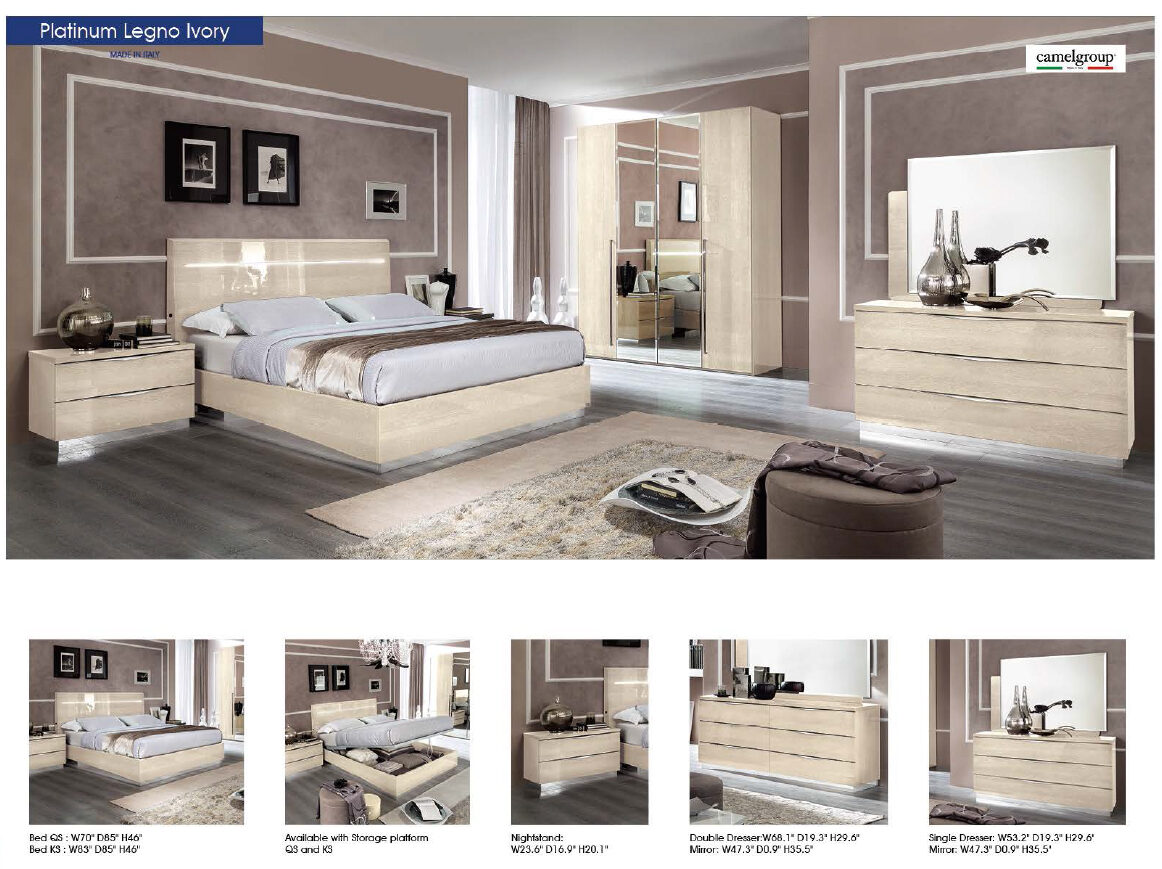 New ivory finish to mark the unique, highly contemporary design of this king bed with high headboard. Modern lines combined with Art Deco details. Beveled mirror and wave shaped handles give a typical Made in Italy look to this bedroom. The bed ring has shaped side rails with chromed skirt. Optional storage kit available.Features: