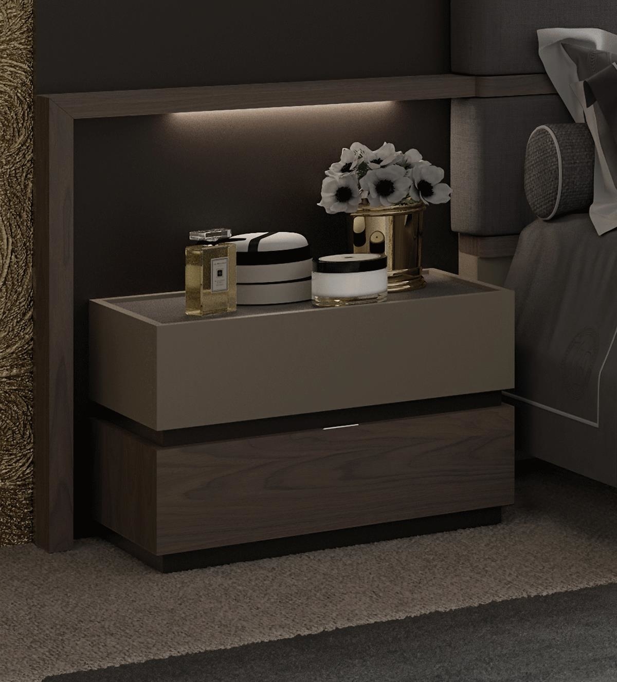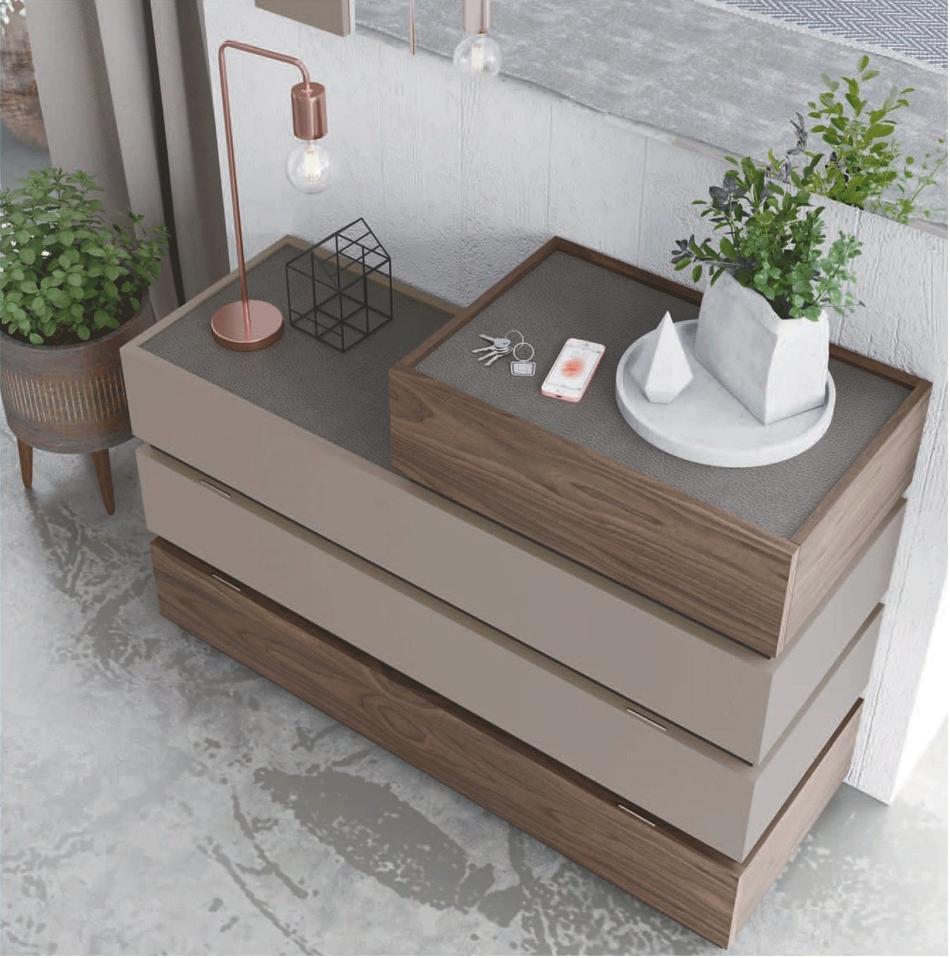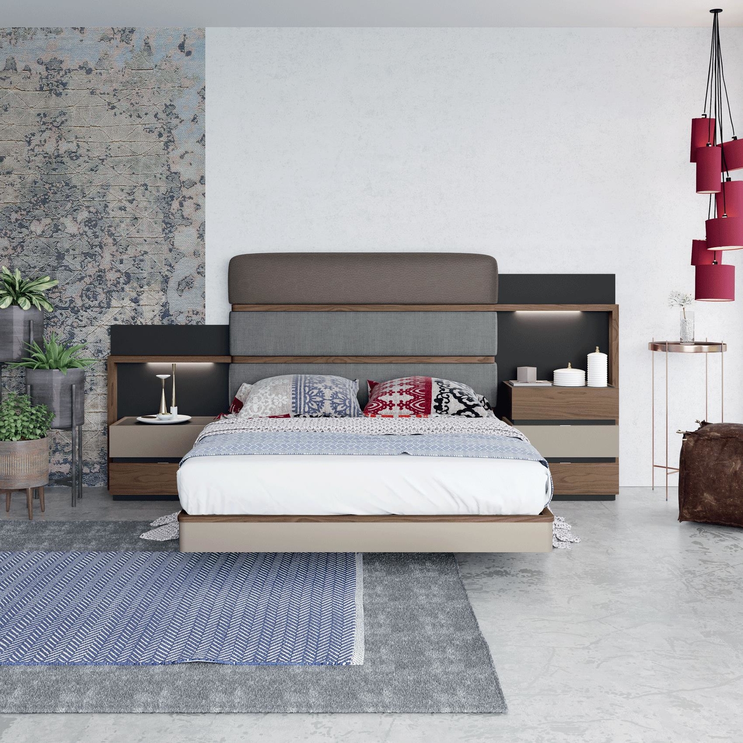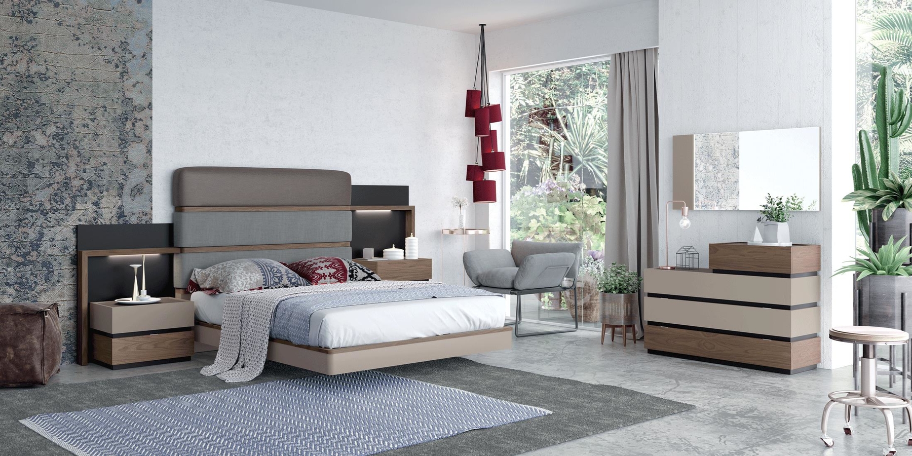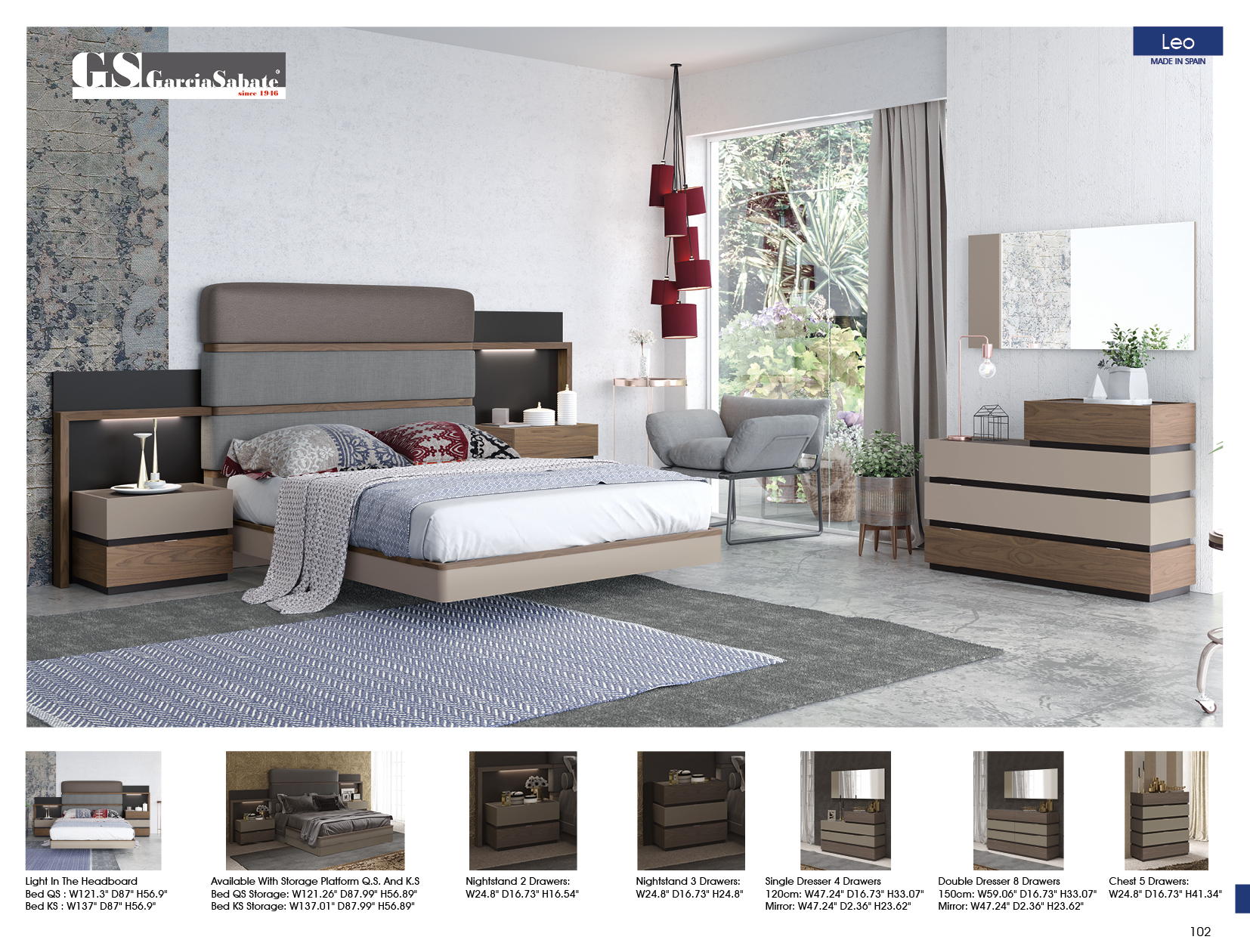 Beauty and the difficulty of this king size bedroom set to achieve a balance that looks attractive, is to precisely mix Eco leather with fabrics and three different finishes (Wood veneer and lacquers). An art in itself extremely complicated and very rarely achieved. Other than the standard conventional elements, this collection has alternative double dresser, chest, 2 door wardrobes options, and also storage option for both beds.Headboard : mix Eco leather with fabrics Topo is the colour name of the Eco leather which is the top upholstered part of the headboard. PERLA is the colour for the fabric upholstered part (the second and third upholstered parts, see extra pictures).