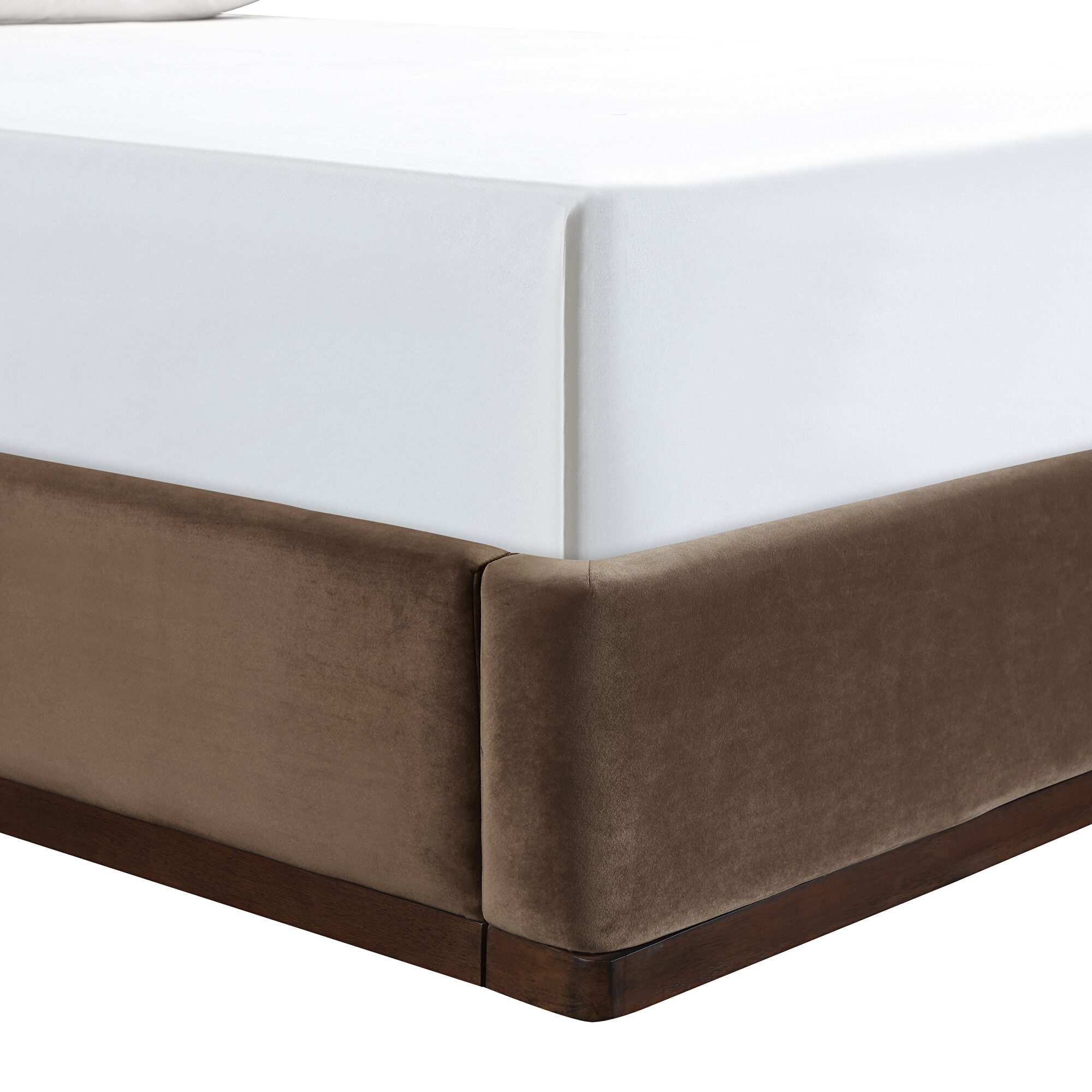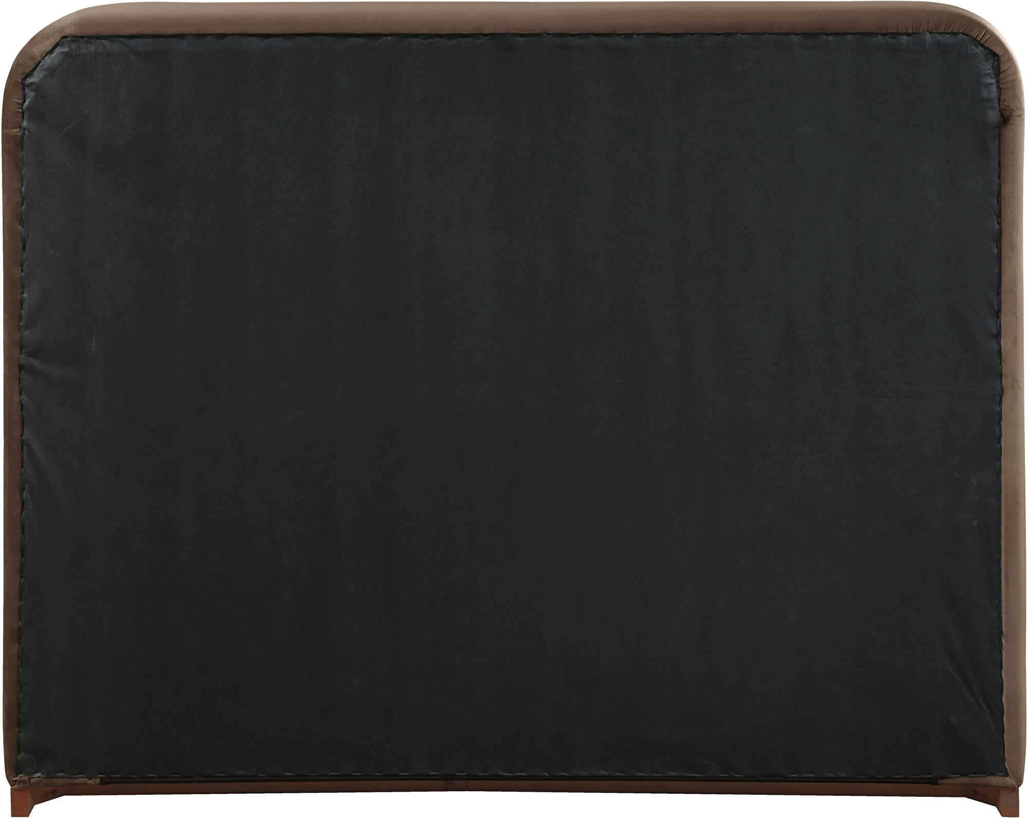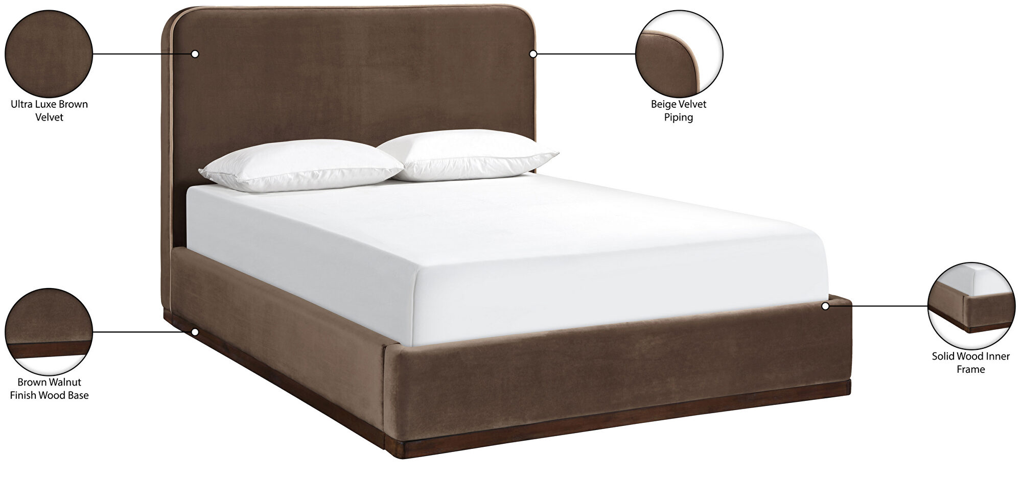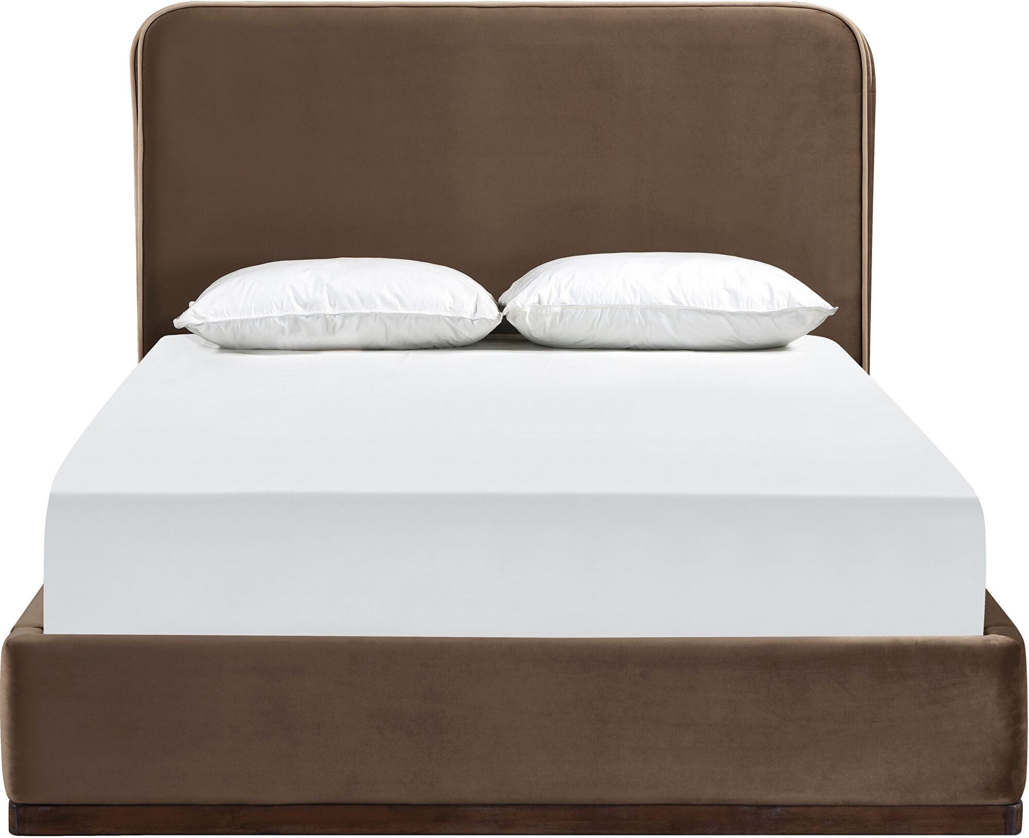 Elevate your bedroom with the Rava Velvet Upholstered King Size Bed in soft brown - a refined centerpiece that blends sumptuous comfort with contemporary style. The plush 460 GSM velvet upholstery creates a smooth, inviting surface, while contrasting brown velvet piping outlines the headboard and base for subtle, sophisticated detailing. A warm brown walnut wood base provides sturdy support and modern appeal, making the Rava bed a seamless fit for both elegant and everyday interiors.Designed for convenience as well as style, the Rava features a fully slatted foundation, eliminating the need for a boxspring and simplifying setup. Available in Queen, King, Full, and Twin sizes, this bed pairs luxurious materials with practical construction to deliver lasting comfort and timeless design.