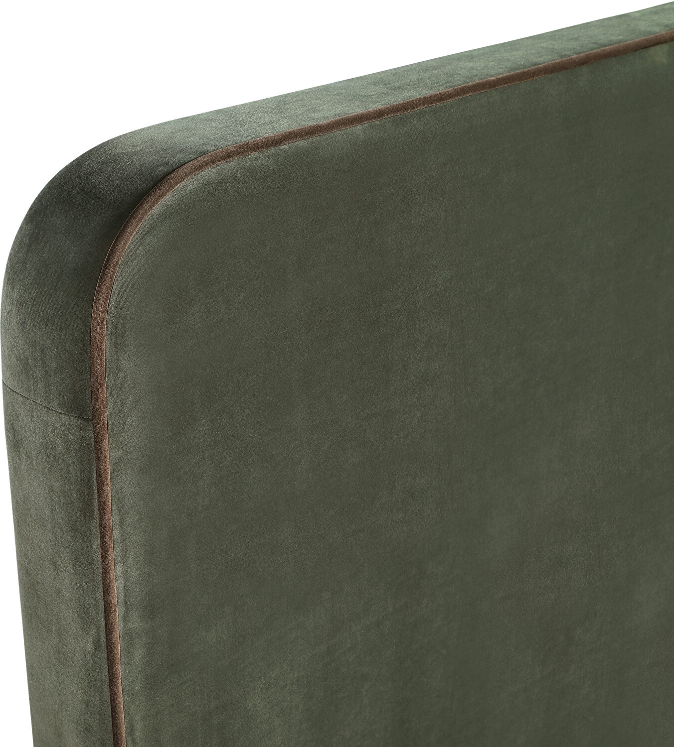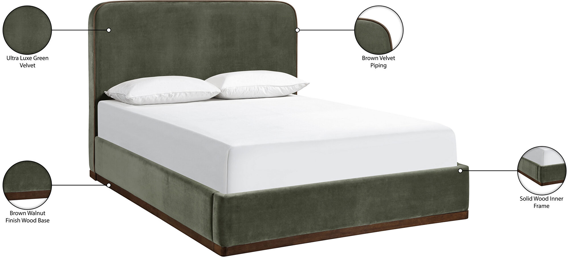 Elevate your bedroom with the Rava Velvet Upholstered King Size Bed in soft green - a refined centerpiece that blends sumptuous comfort with contemporary style. The plush 460 GSM velvet upholstery creates a smooth, inviting surface, while contrasting brown velvet piping outlines the headboard and base for subtle, sophisticated detailing. A warm brown walnut wood base provides sturdy support and modern appeal, making the Rava bed a seamless fit for both elegant and everyday interiors.Designed for convenience as well as style, the Rava features a fully slatted foundation, eliminating the need for a boxspring and simplifying setup. Available in Queen, King, Full, and Twin sizes, this bed pairs luxurious materials with practical construction to deliver lasting comfort and timeless design.