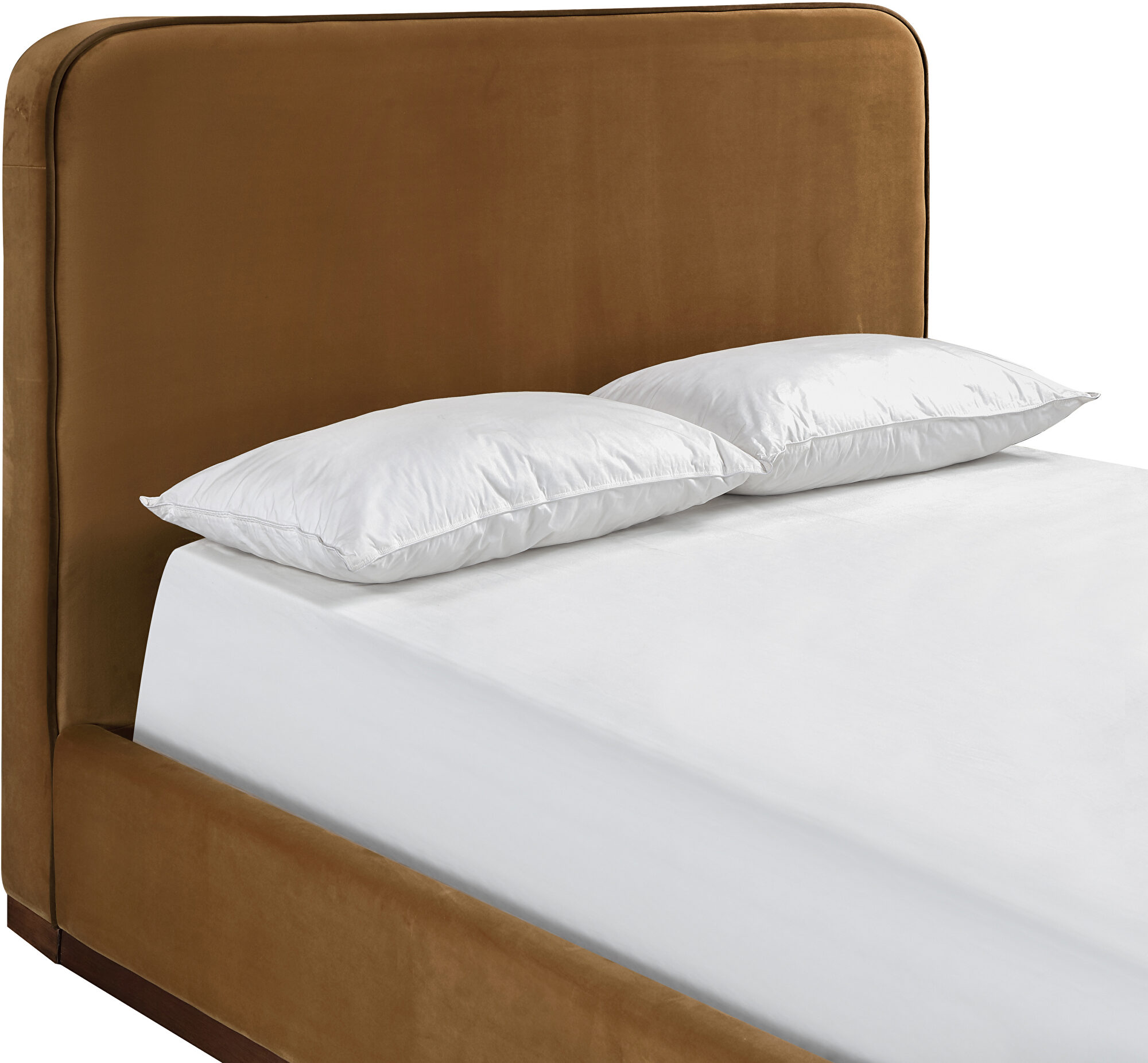 Elevate your bedroom with the Rava Velvet Upholstered King Size Bed in soft saddle - a refined centerpiece that blends sumptuous comfort with contemporary style. The plush 460 GSM velvet upholstery creates a smooth, inviting surface, while contrasting brown velvet piping outlines the headboard and base for subtle, sophisticated detailing. A warm brown walnut wood base provides sturdy support and modern appeal, making the Rava bed a seamless fit for both elegant and everyday interiors.Designed for convenience as well as style, the Rava features a fully slatted foundation, eliminating the need for a boxspring and simplifying setup. Available in Queen, King, Full, and Twin sizes, this bed pairs luxurious materials with practical construction to deliver lasting comfort and timeless design.