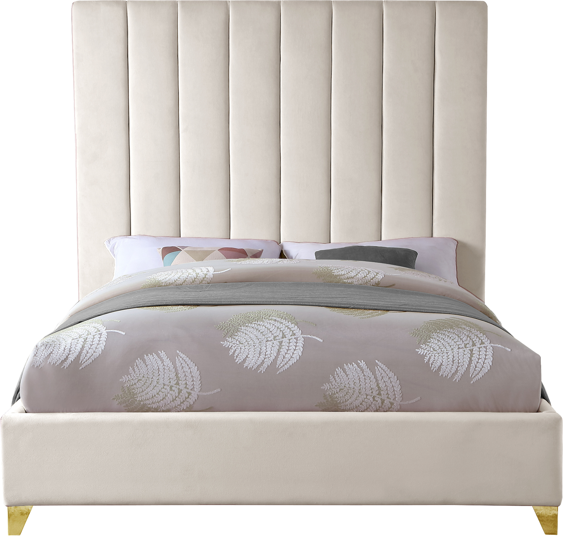 Take the look of your bedroom to new decorative heights with this ultra-modern Via king-sized upholstered bed. Sleek cream velvet upholstery gives this bed a true upscale feel and epitomizes fine living while channel tufting along the headboard keeps the padded material inside plump and aloft so it cradles your body while you sit up in bed to watch TV or read. Metal legs bring this platform bed up off the floor, allowing clearance below for cleaning and adding to its svelte contemporary profile.Features: