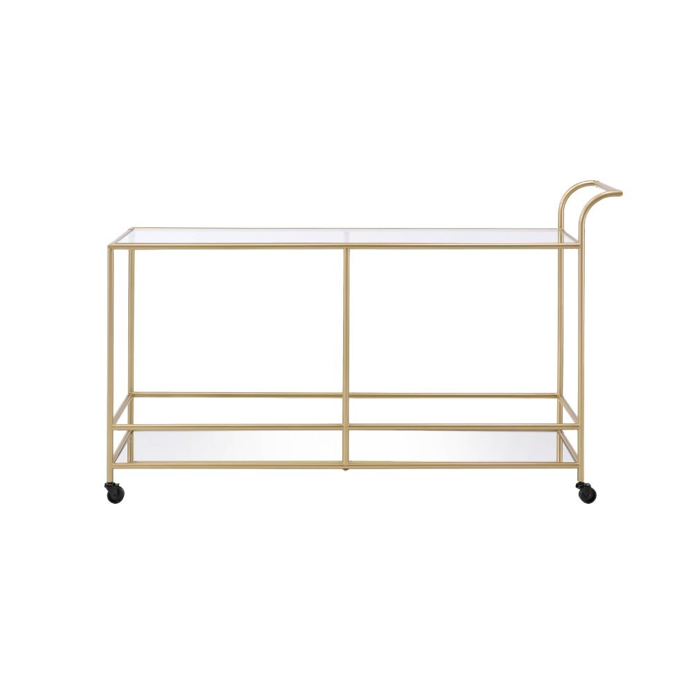 Designed to add luxurious and sophisticated touch to your dining area, this Kenda serving cart is a great option for keeping your favorite bottles in easy reach. The top shelf is crafted with 5mm tempered clear glass and the bottom shelf is mirrored. The simple straight lines design proves exceptional display capacity. With the frame finished in gold coating, it will round out your home with a glamorous touch.Features: